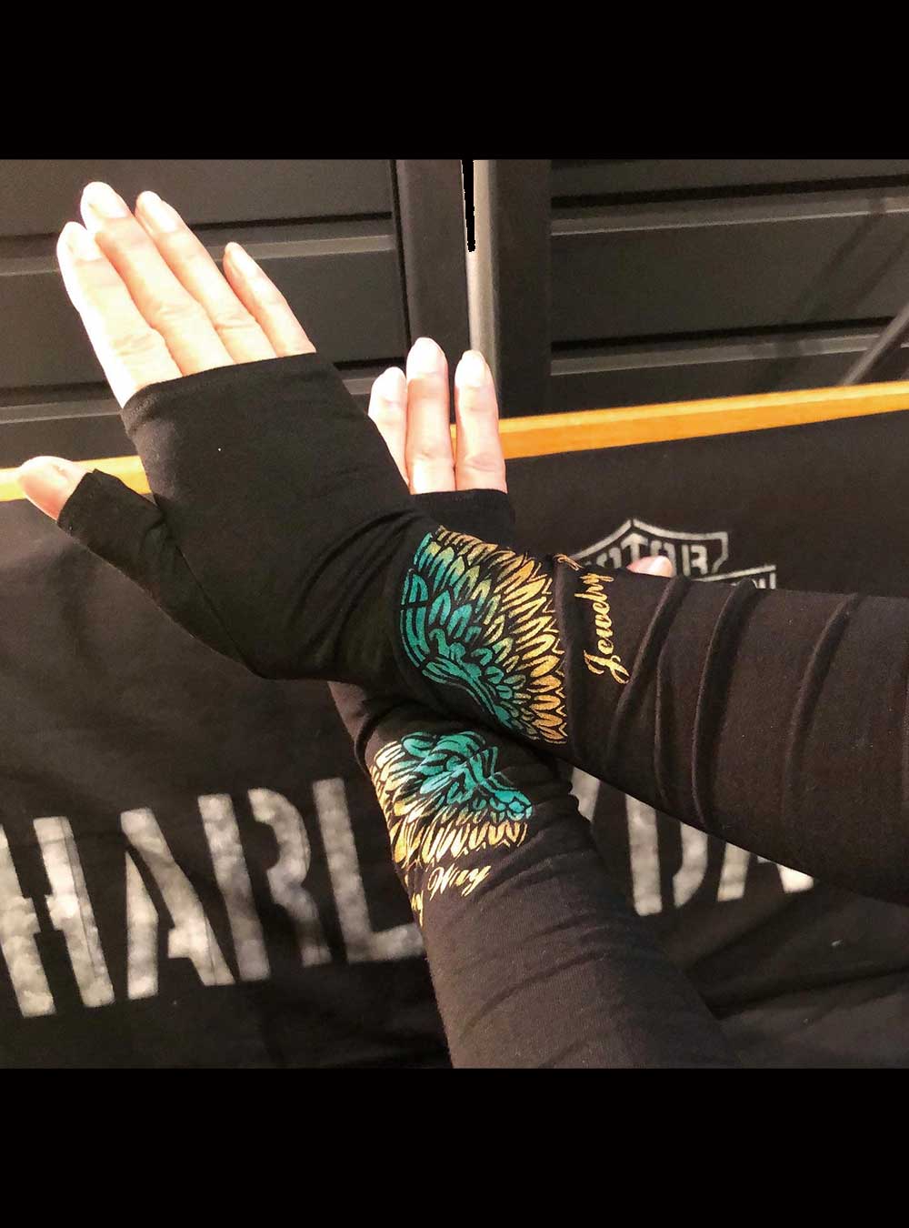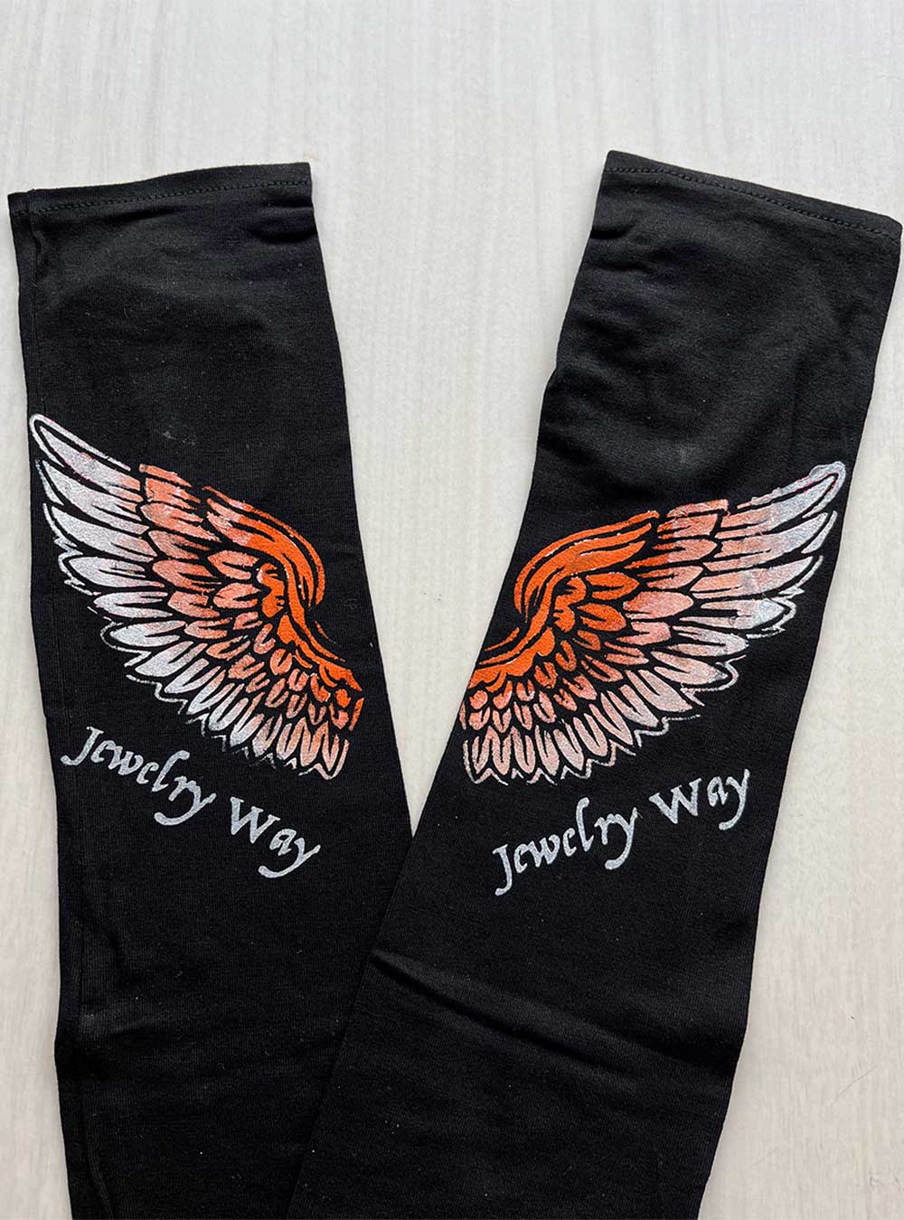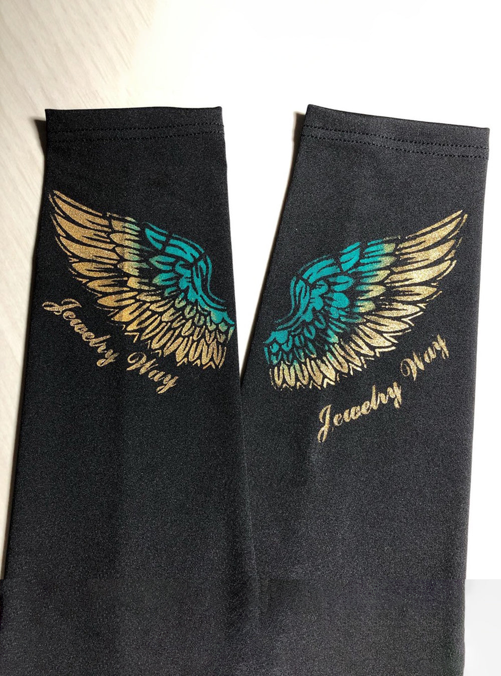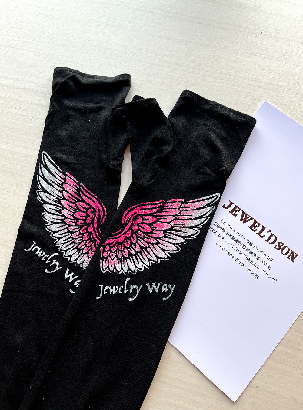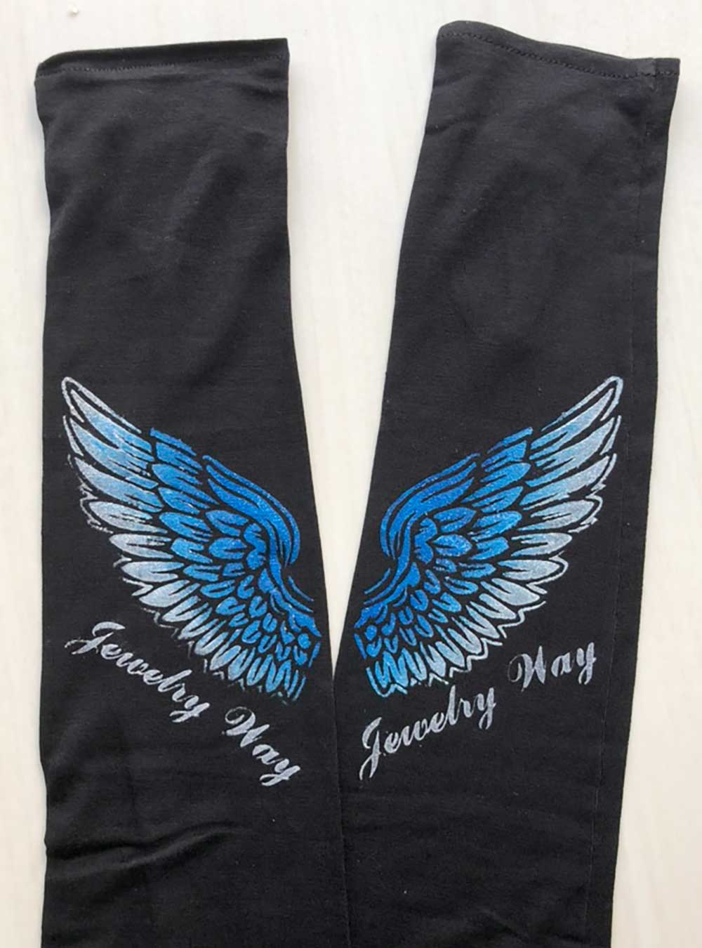 Wingデザイン、アームカバー。羽のラメ入りグラデーションをステンシル。ロングタイプ(親指あり)アームカバーの上にグローブを履いて日焼け対策完璧! 親指ありなのでアームカバーが上がって手首や焼ける心配なし!! しかも可愛いのでオススメです。