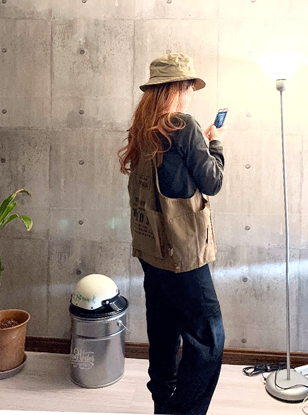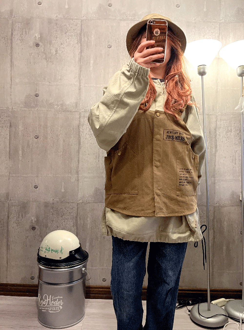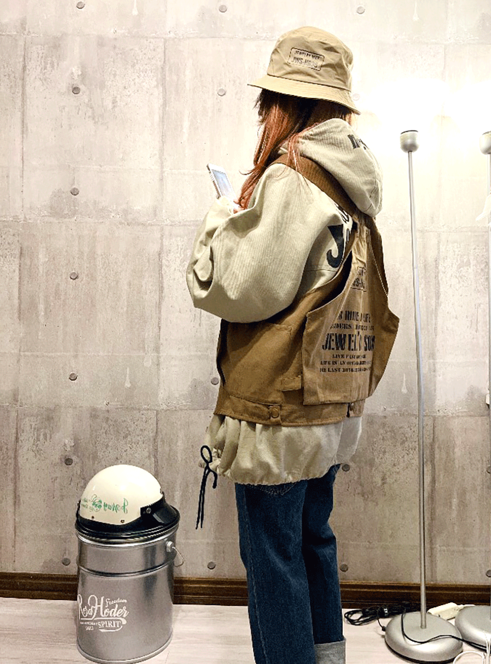 アウターの上から、パーカーやロンTなど合わせて、バケットハットを合わせると一気にキマル! モデル163cmの着こなしパターンを参考にしてください。
