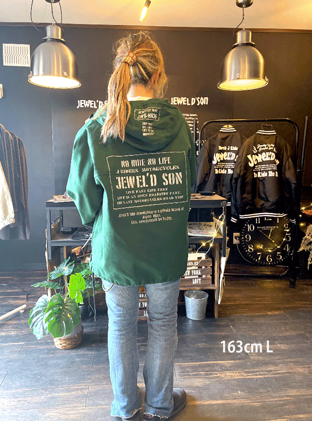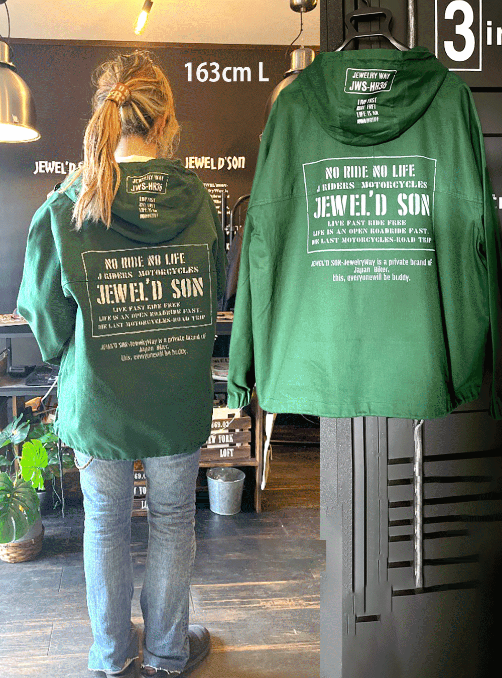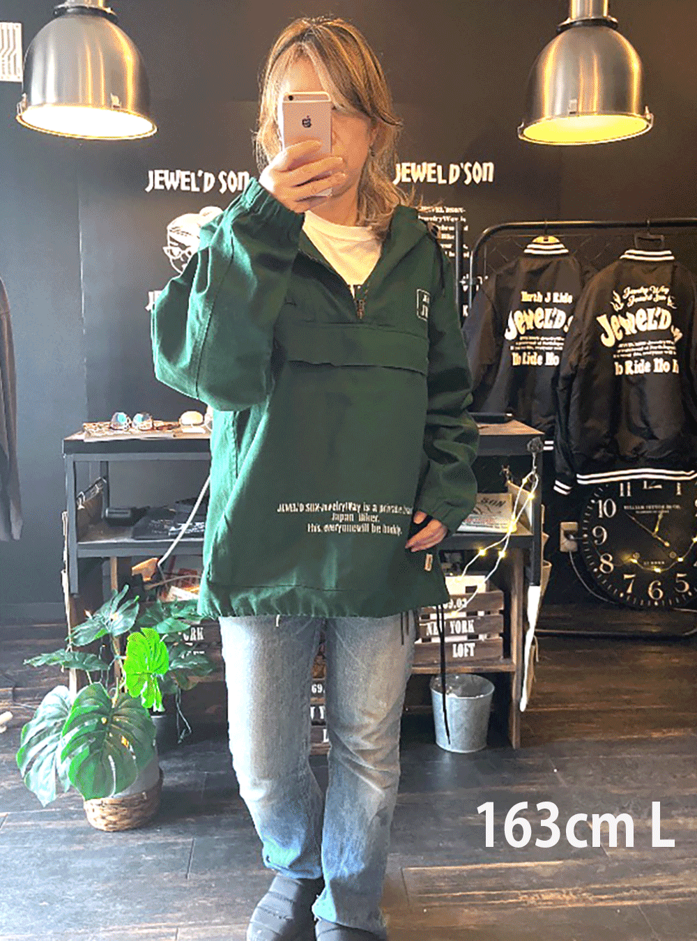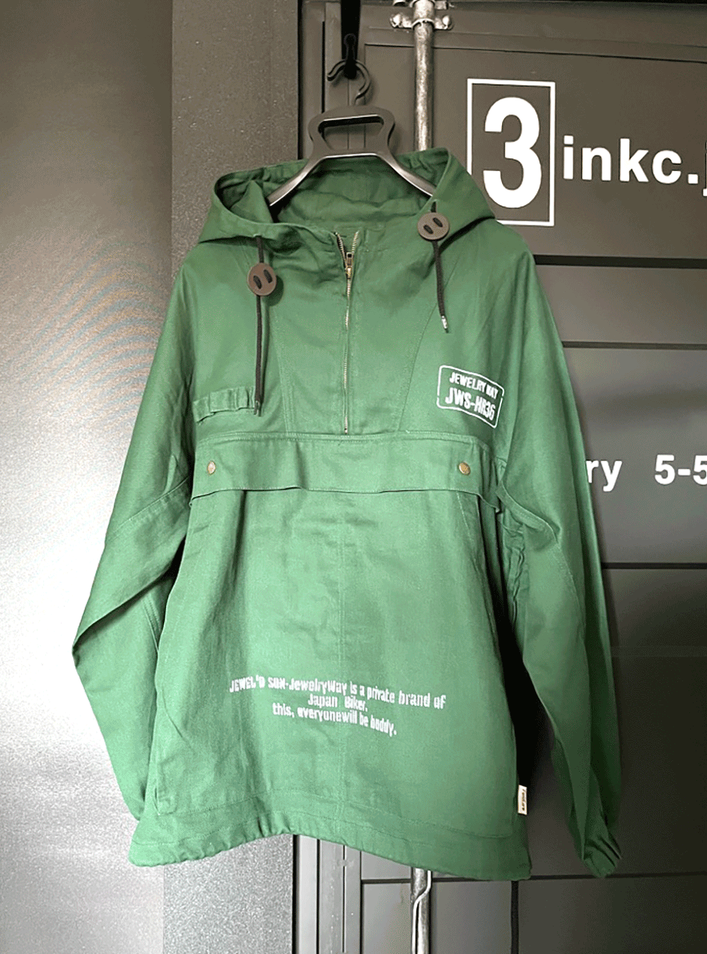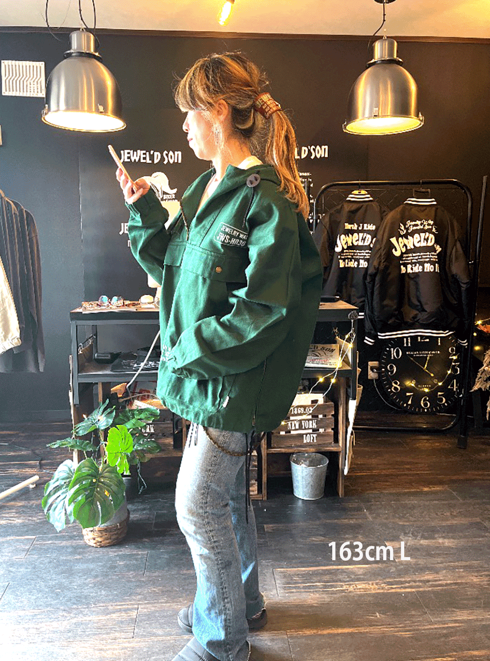 コットンアノラックパーカー。左右が仕切られている大きなポケットでたっぷり収納。サクッとスマートフォン等を入れられるカンガルーポケット。 裾は調節紐付きでしぼって可愛さアップ! カスレ、にじみがアジのステンシルでオシャレにデザイン。
