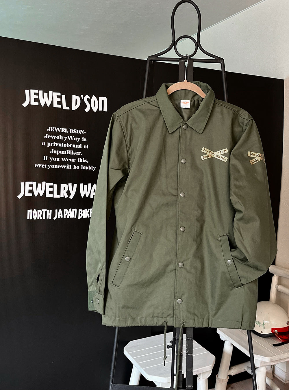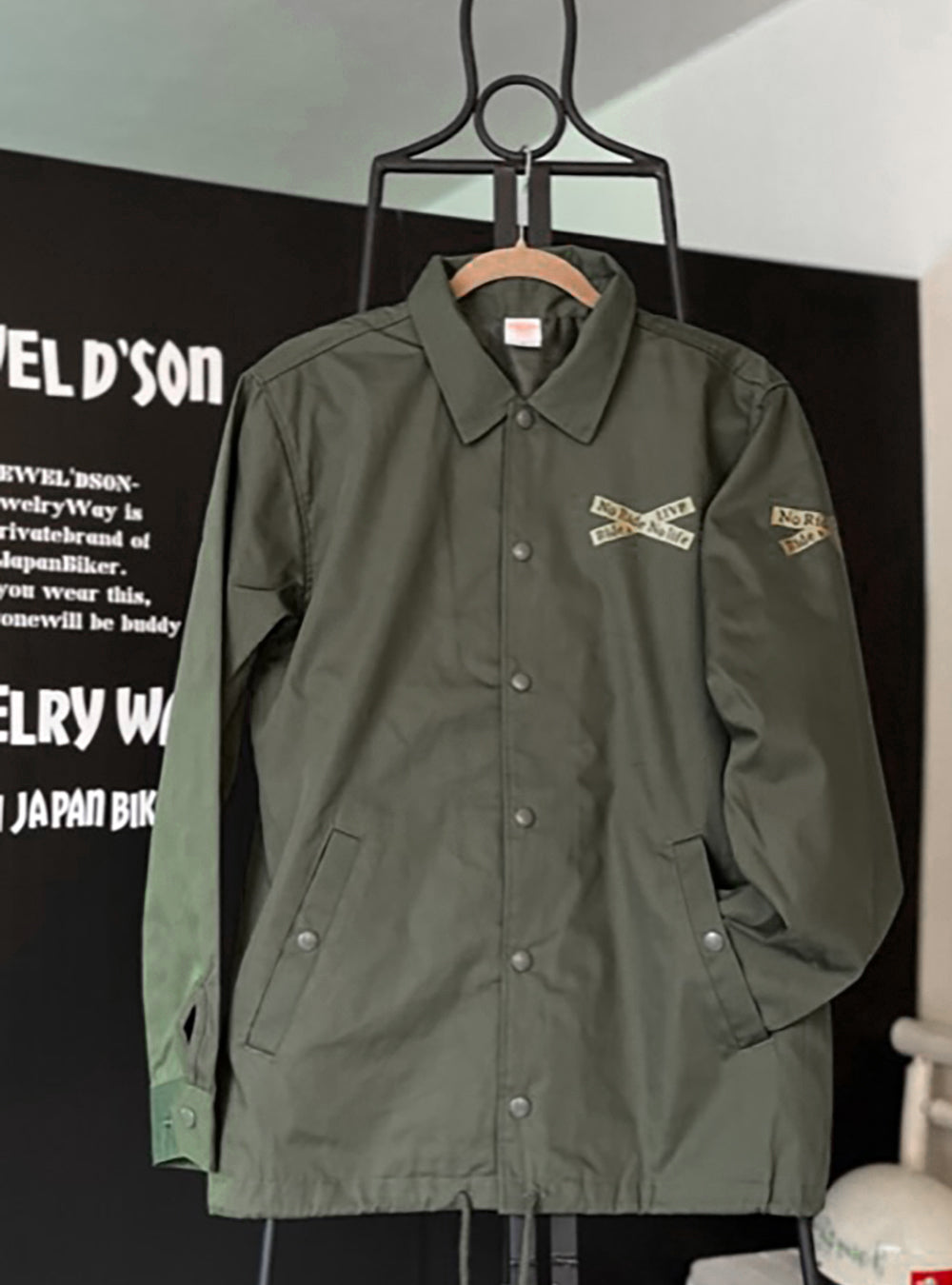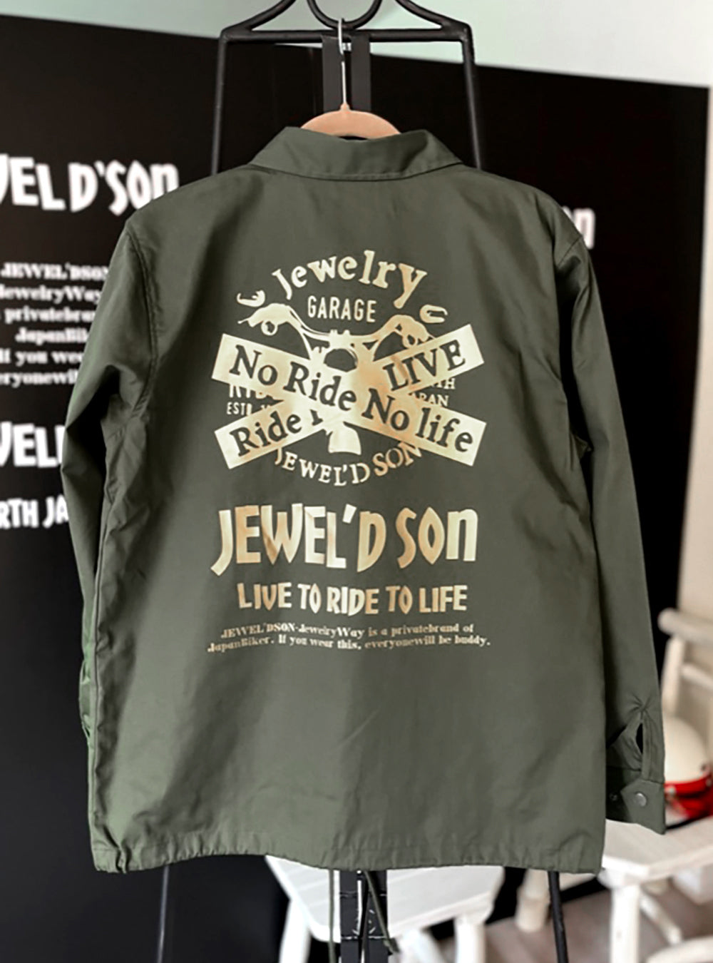 オリーブドラブ色のコーチジャケット。T/Cウェザーのマットな生地で仕上げ、L.A.ワーカーのスタイルを体現。JEWEL'D SON Xdesignをゴールドでプリント。カジュアルコーディネートにも!