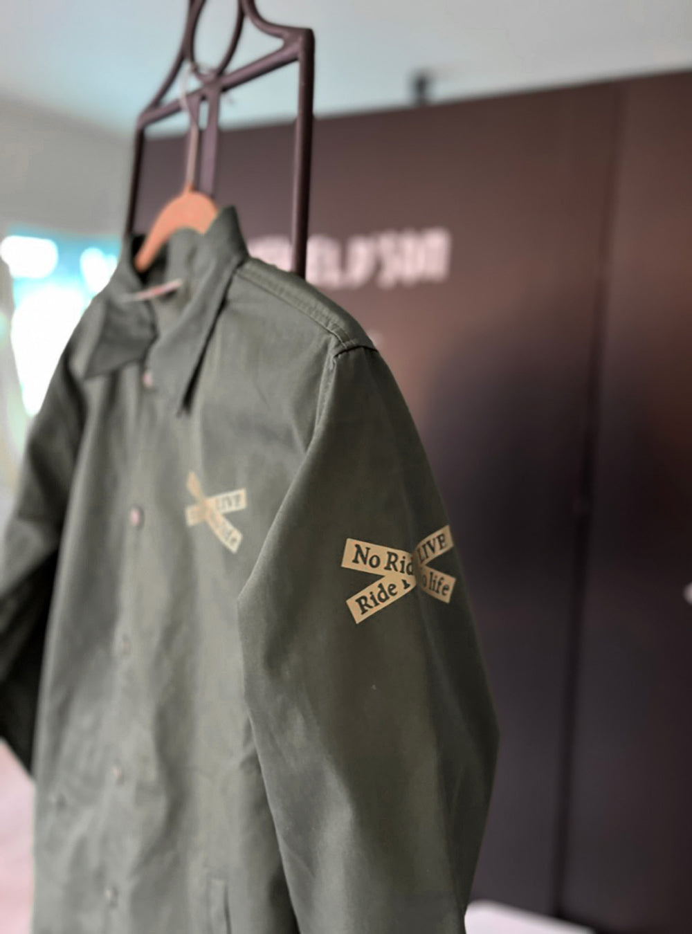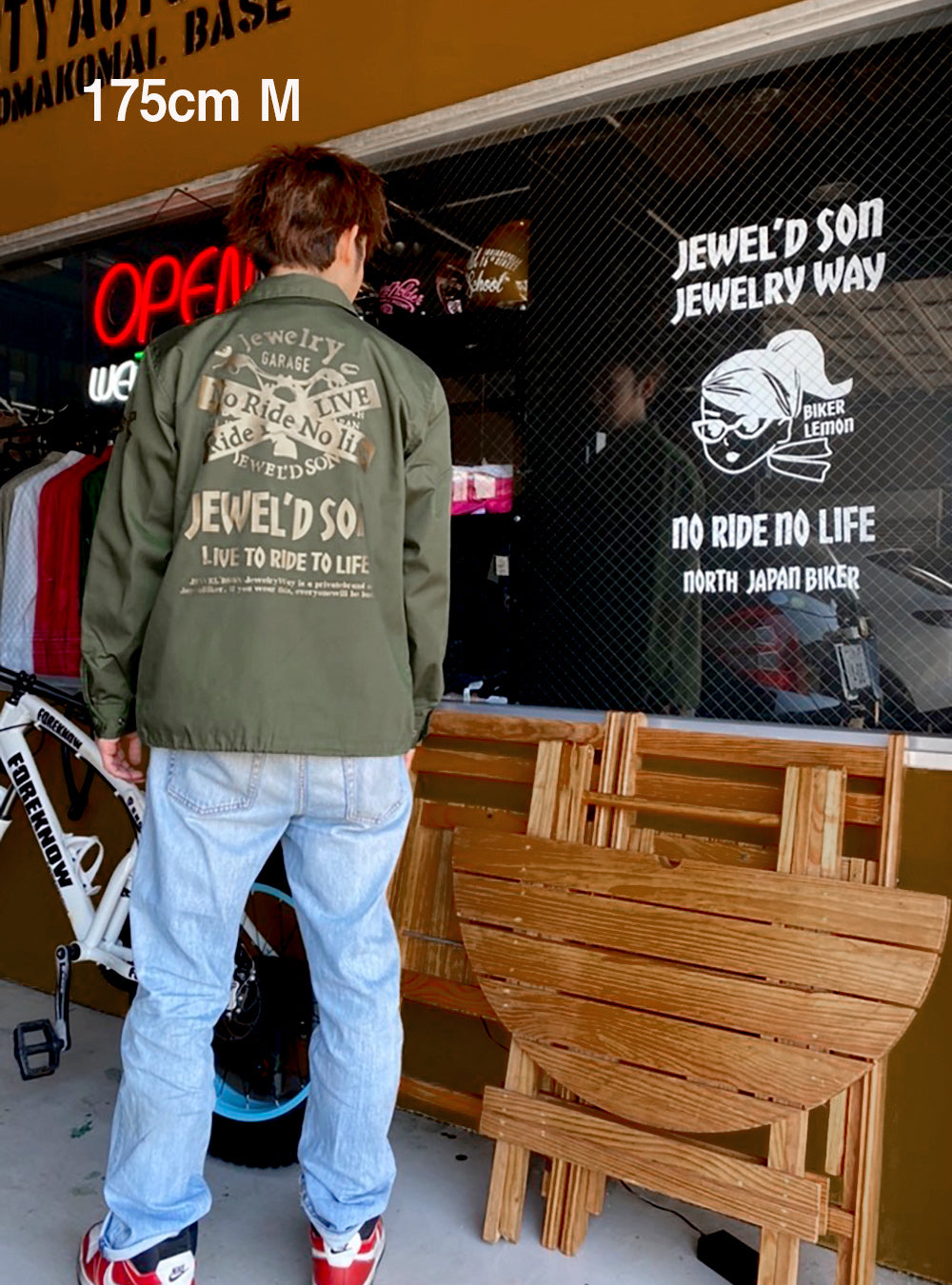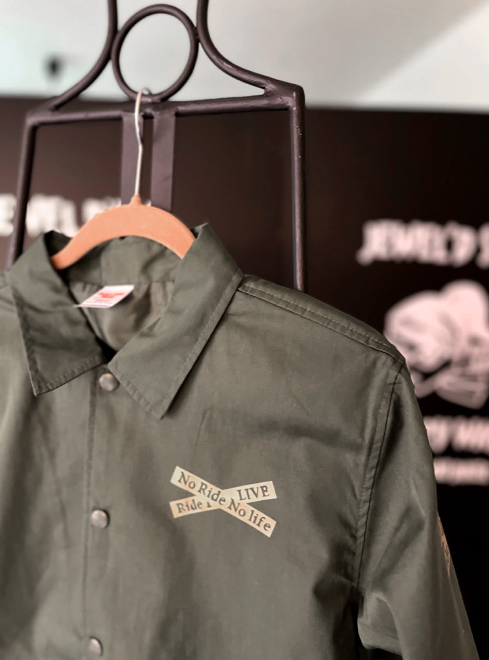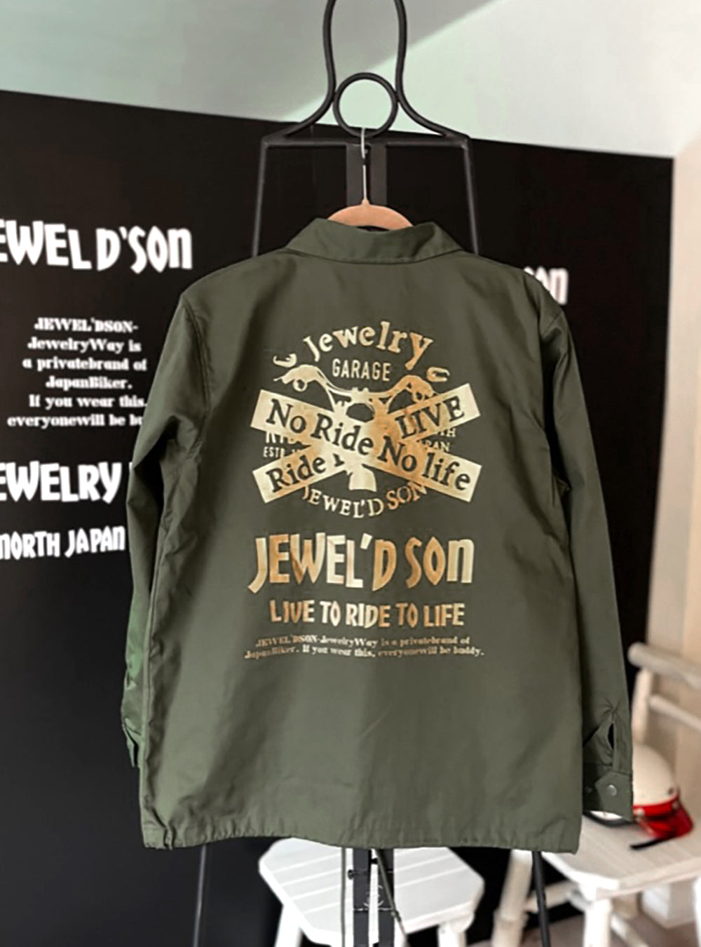 オリーブドラブ色のコーチジャケット。T/Cウェザーのマットな生地で仕上げ、L.A.ワーカーのスタイルを体現。JEWEL'D SON Xdesignをゴールドでプリント。カジュアルコーディネートにも!