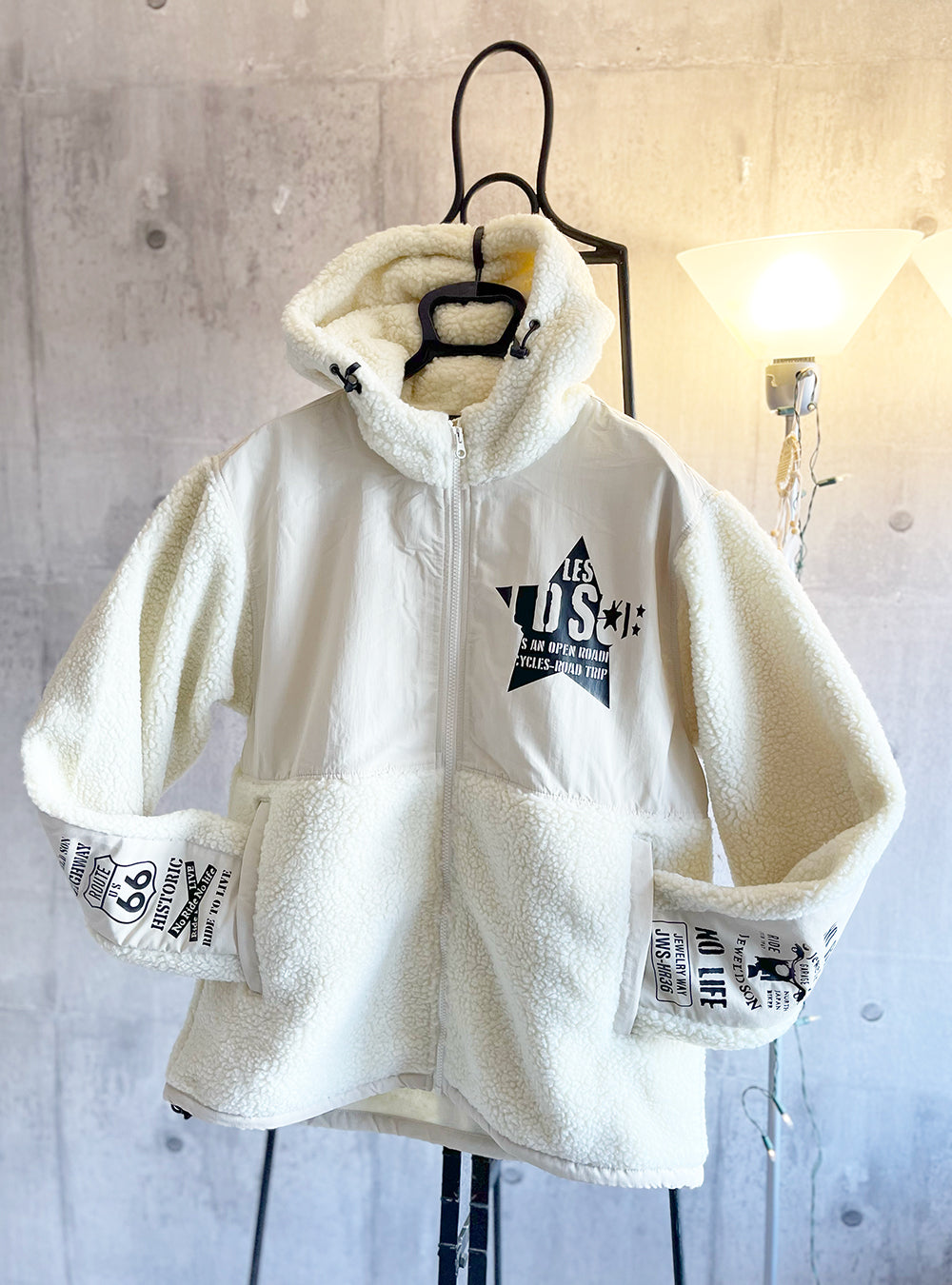 ボリューム感たっぷりのフードと、袖のステッカーイメージのプリントが決め手。