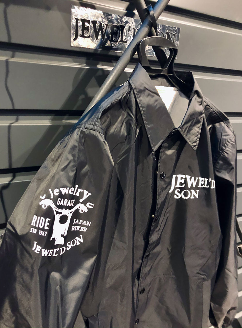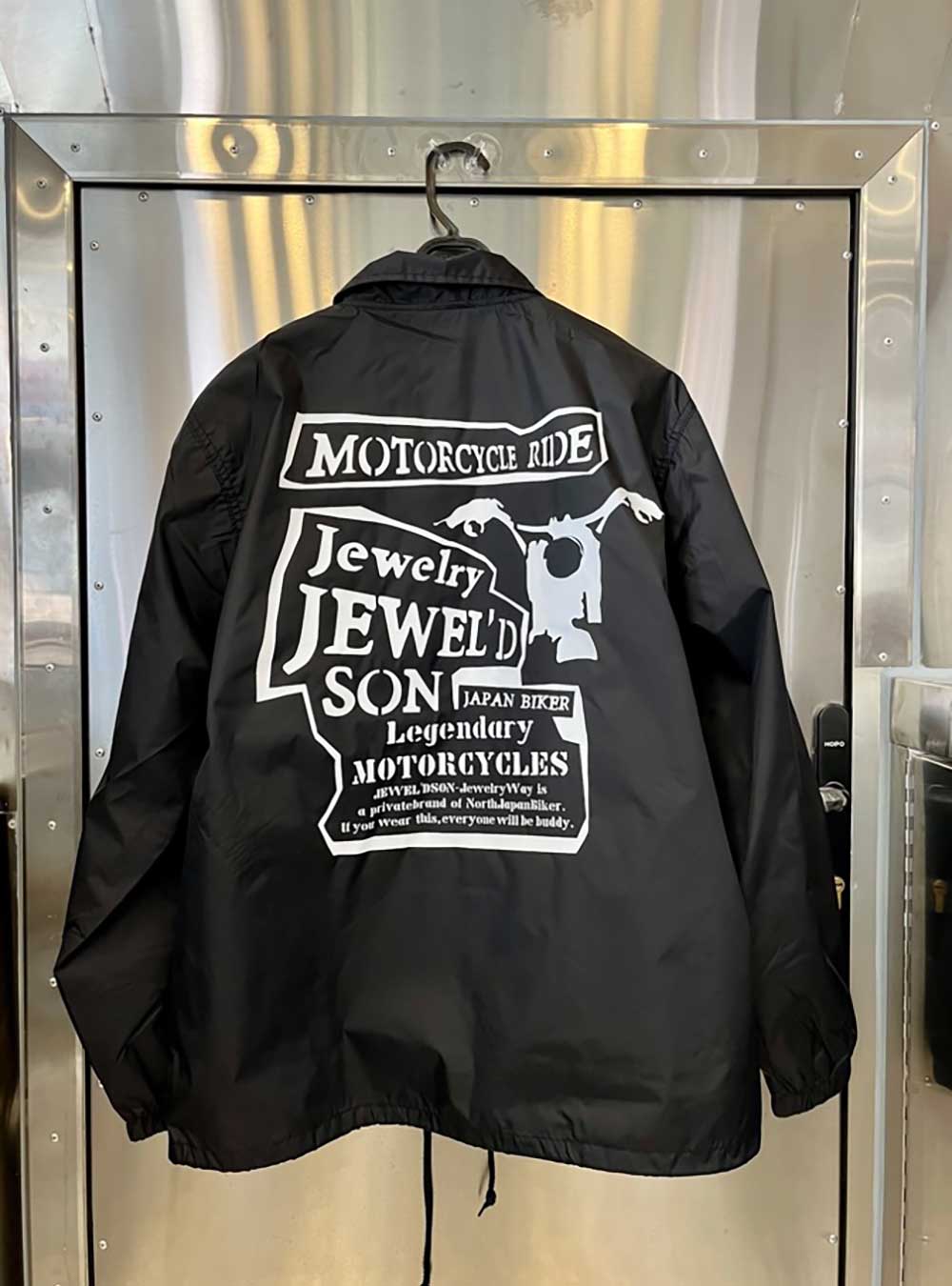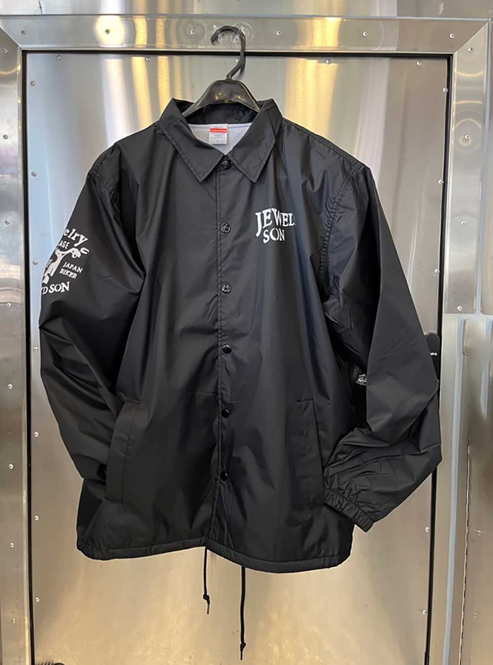 背中にはバイクシルエットをあしらった「Jewel'd son」ロゴを大胆にプリントして存在感抜群のコーチジャケットです。