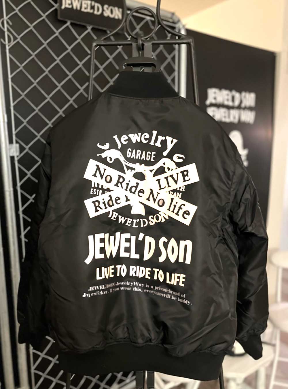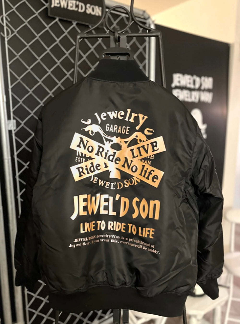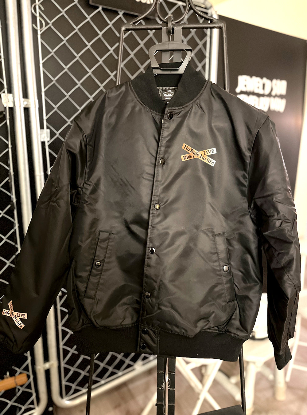 表地にはナイロン素材を採用。形はバルーンシルエットでスウェットなどの上からでもゆったりと着こなせます。バイクと✖️ロゴがクロスしたクロスデザイン。白、ピンクゴールド、ゴールドのプリントがお選びいただけます。