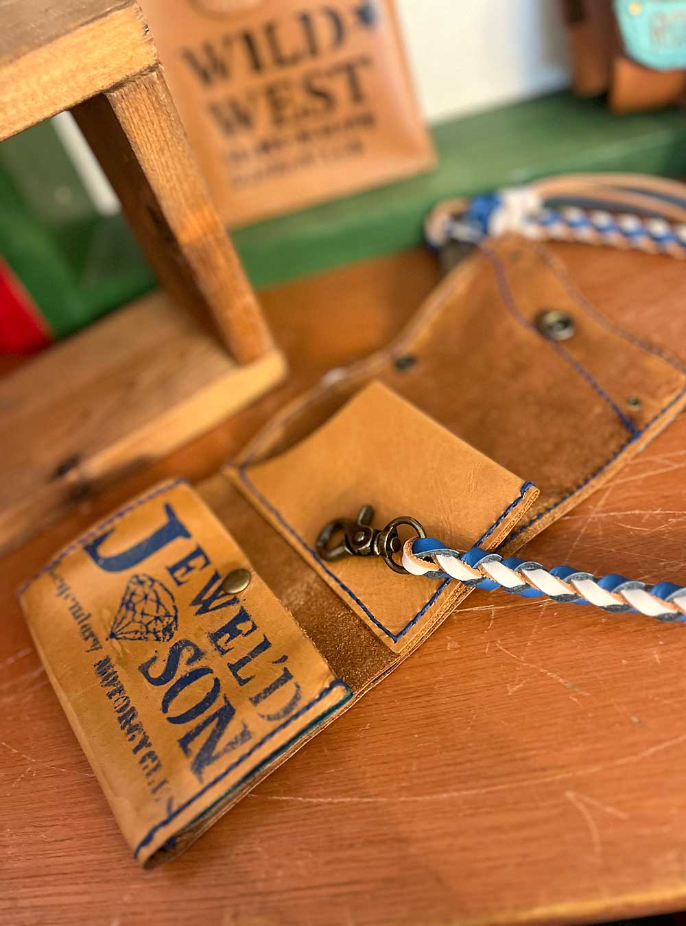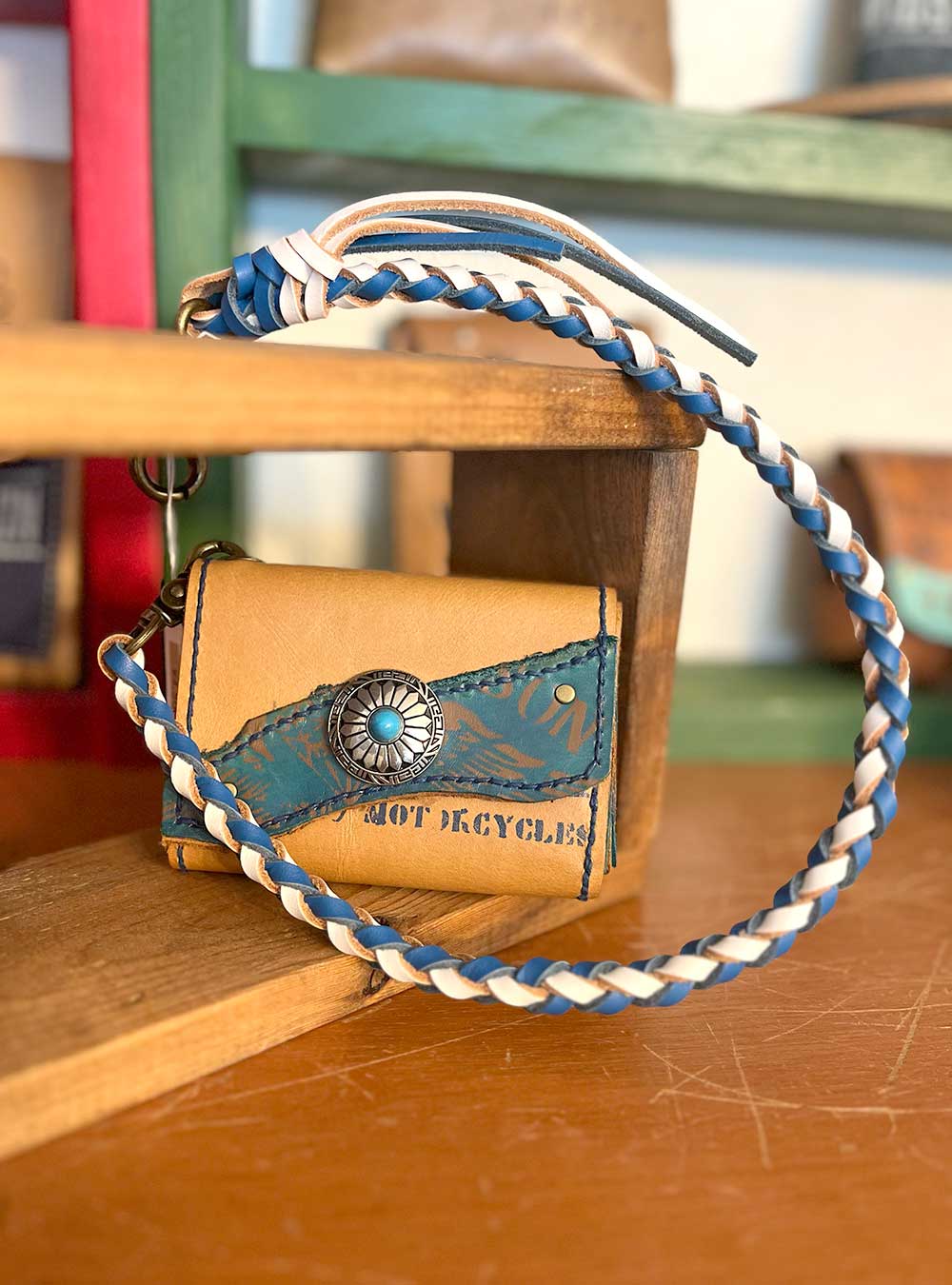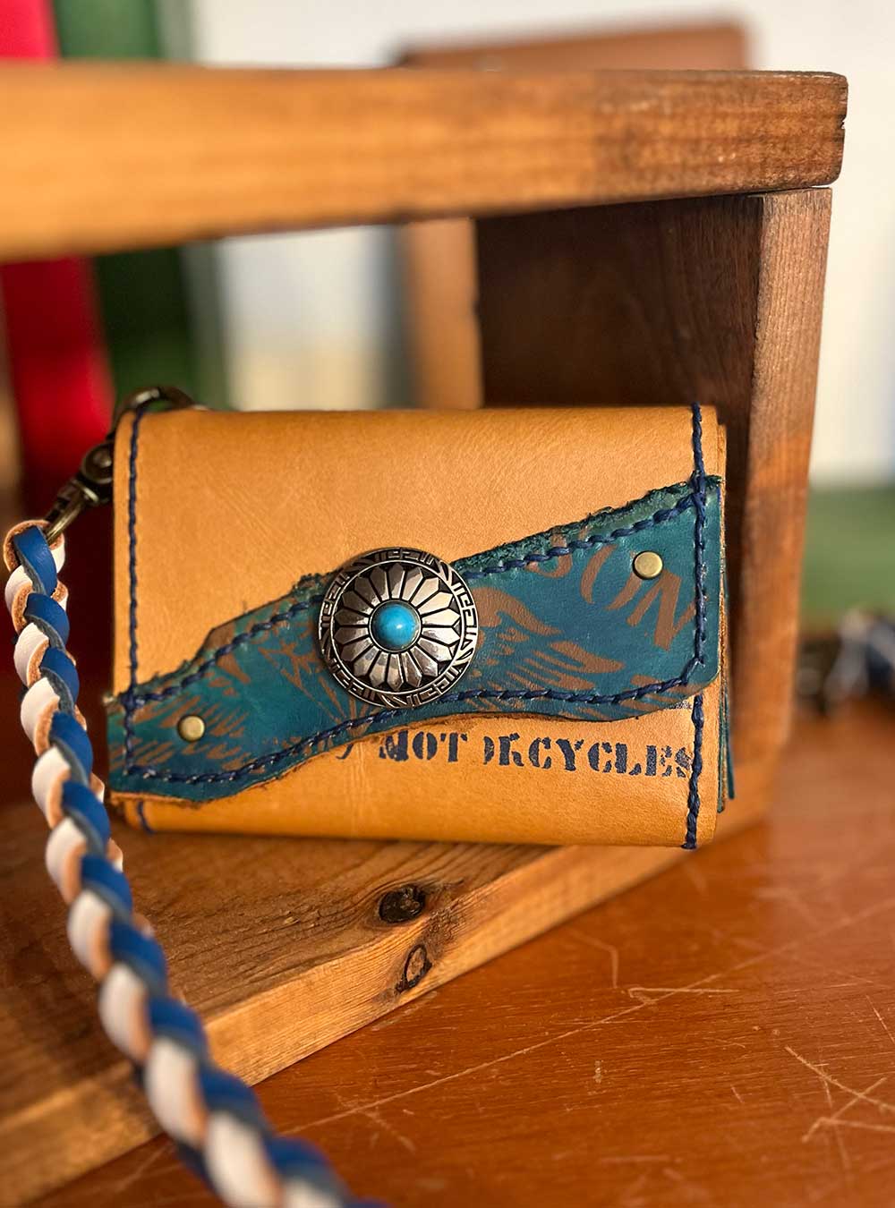 レザーチェーン付き(ブルーホワイト)コンパクトなお札、小銭、カードは10枚くらい入り、優れもの!キャメルの牛革に切り端を活かしたレザーを青で手染め。ステンシルで羽根の絵柄を入れてコンチョをつけました。