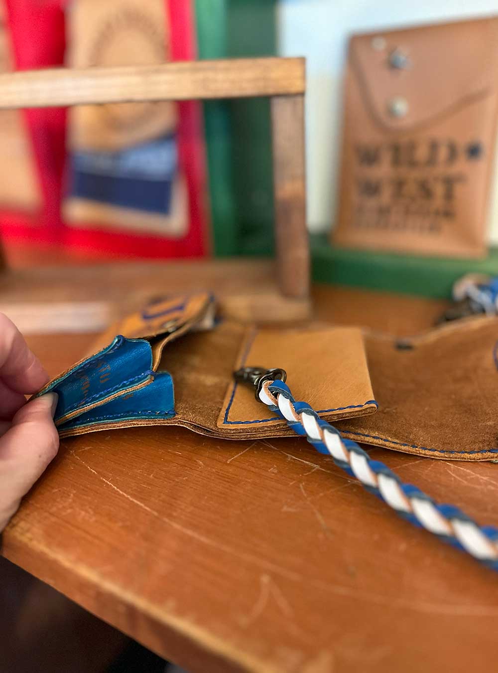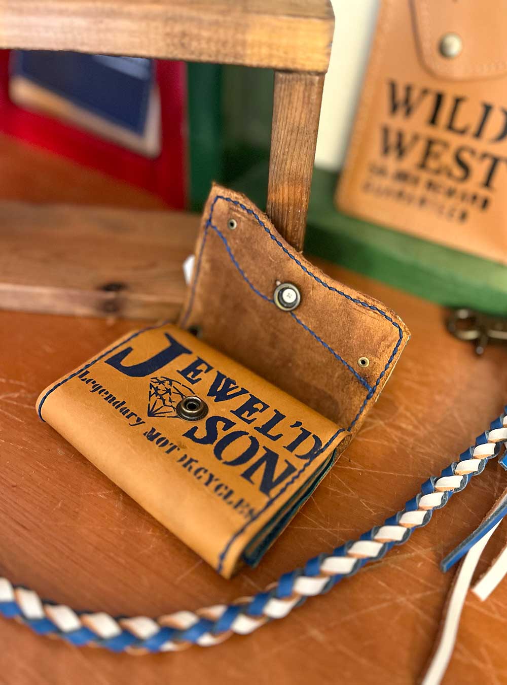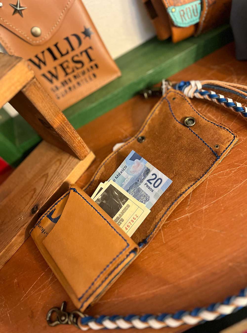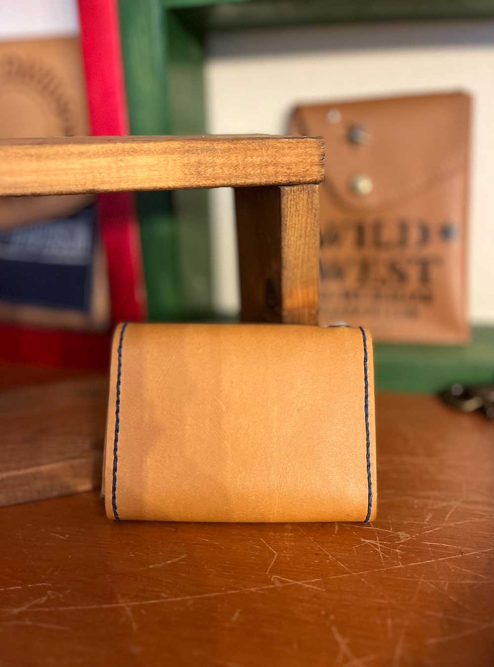 レザーチェーン付き(ブルーホワイト)コンパクトなお札、小銭、カードは10枚くらい入り、優れもの!キャメルの牛革に切り端を活かしたレザーを青で手染め。ステンシルで羽根の絵柄を入れてコンチョをつけました。