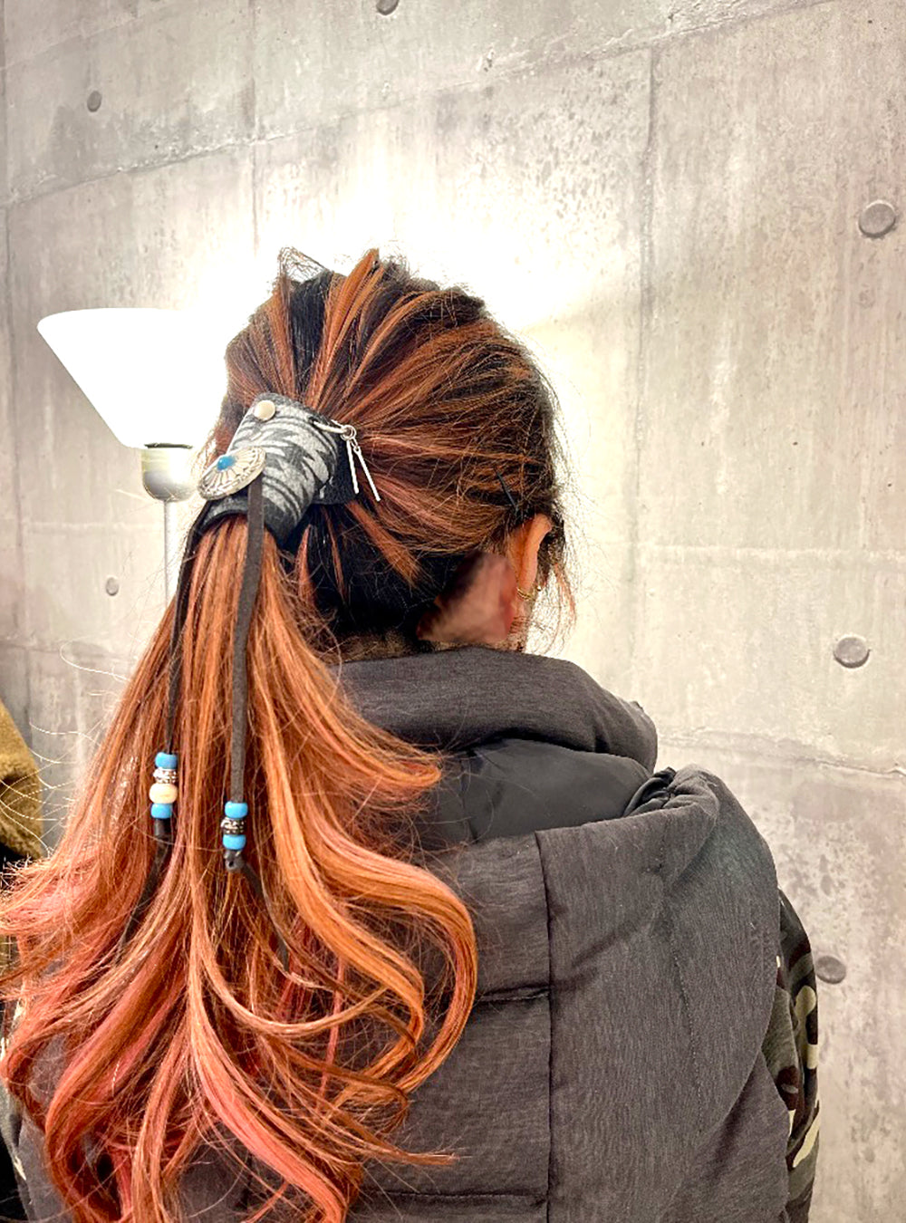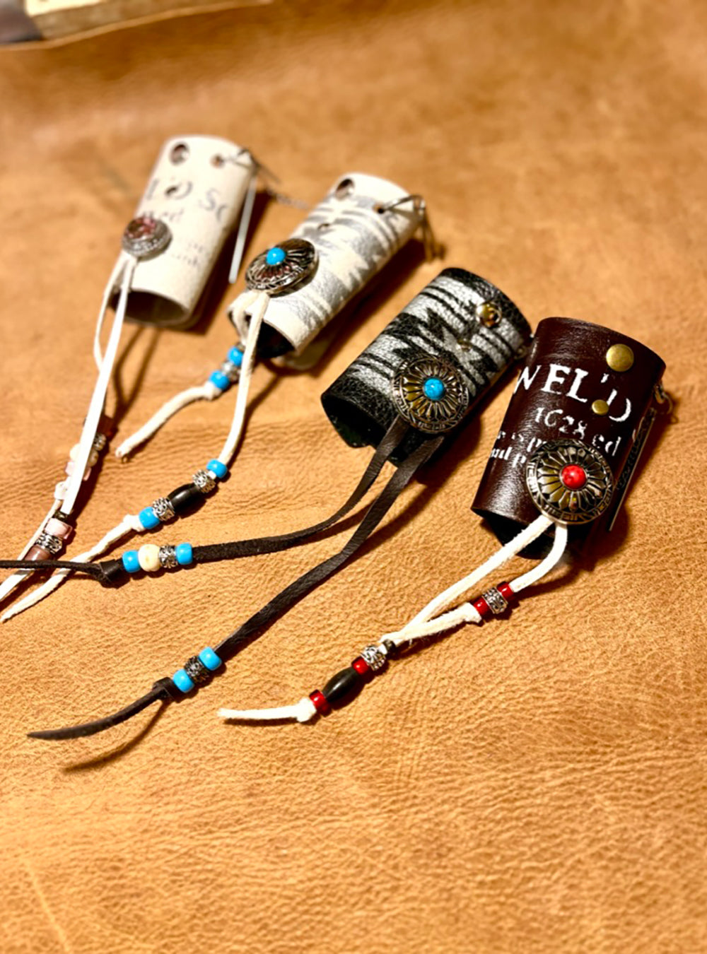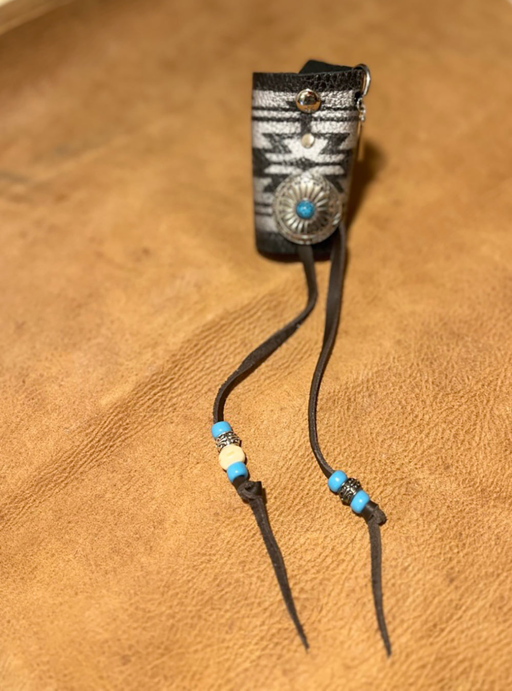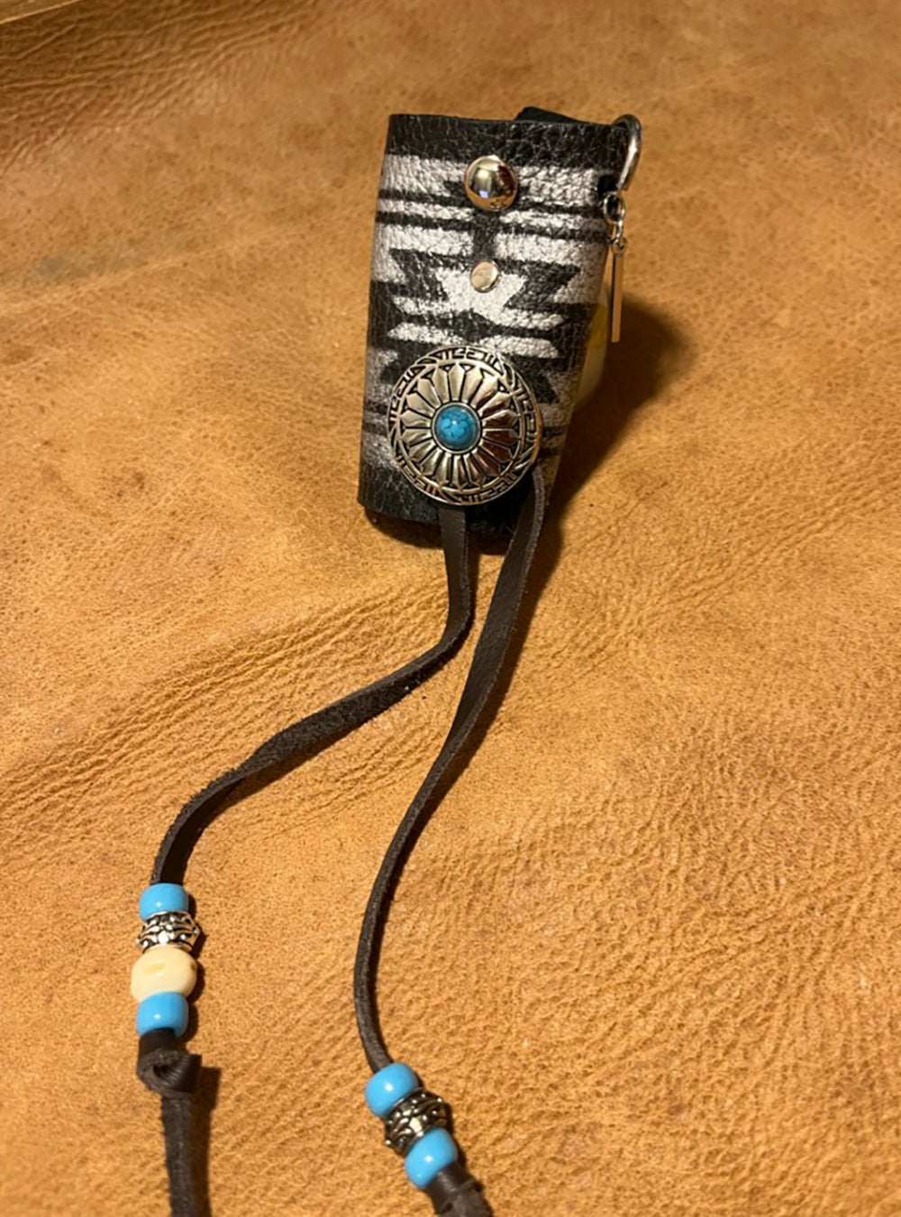 レザーにオルテガ柄をシルバーでステンシル。コンチョとホワイトビーズでデザイン💎✨ 一点物。取り付けはフックではなくヘアゴムタイプなので、バイクやスポーツでも外れる心配がなくて安心
