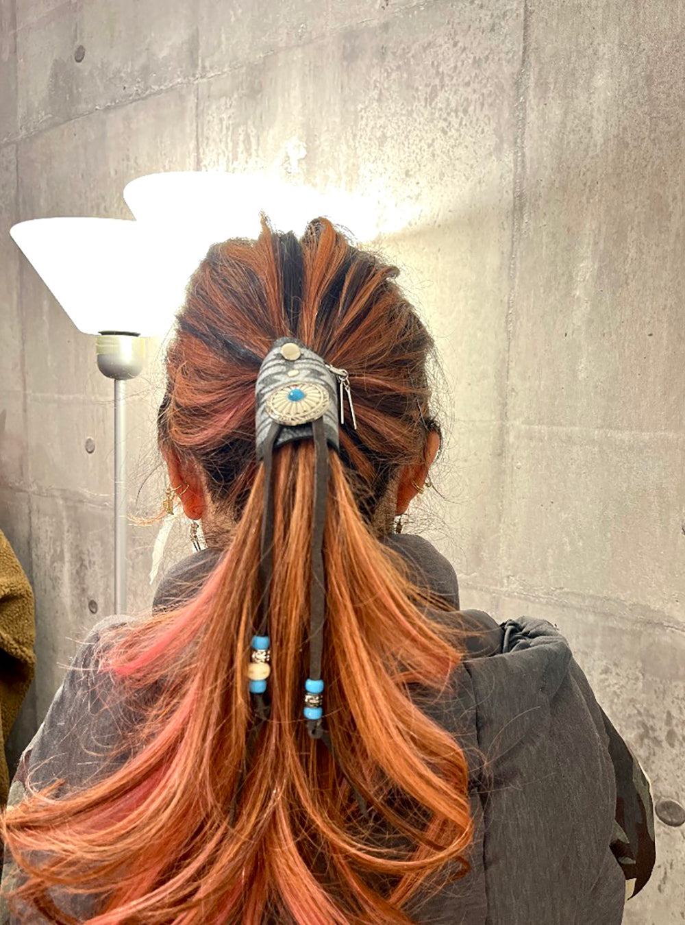 素材/牛革、コンチョ、ホワイトハートビーズ、ヘアーゴム