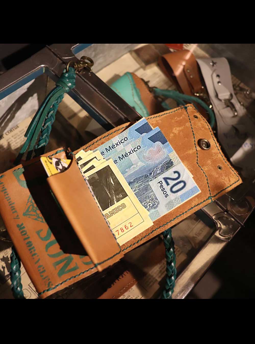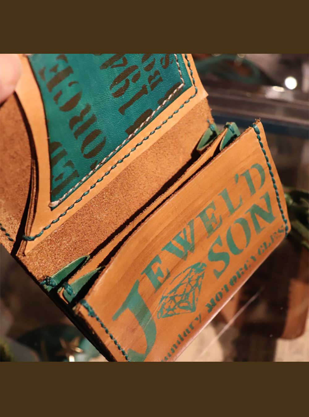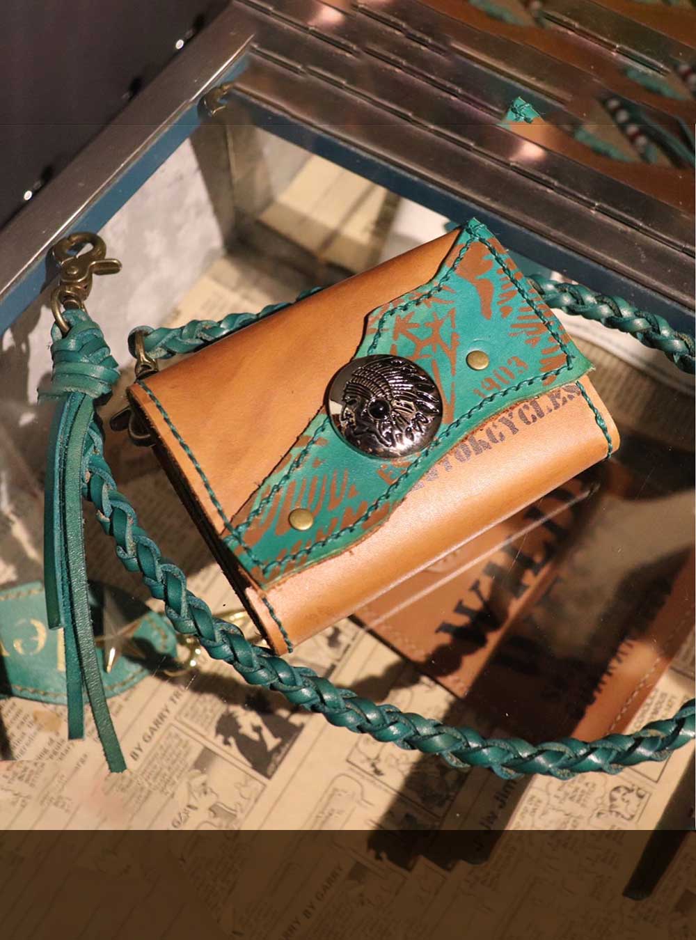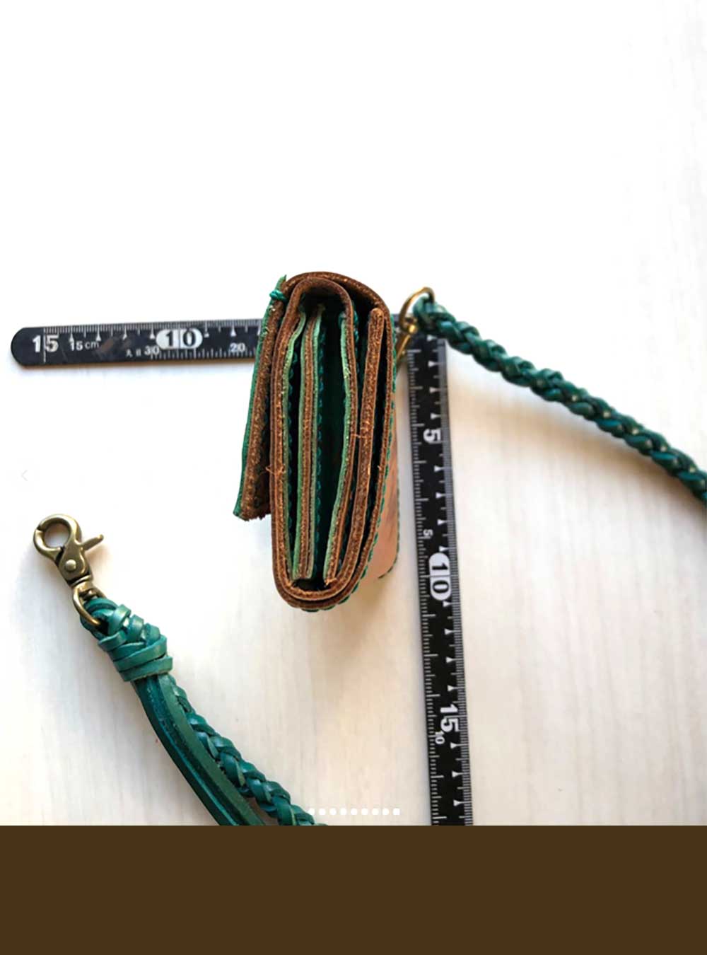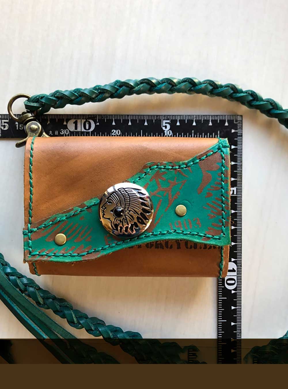 レザーチェーン付き(グリーン)ミニロングウォレット。コンパクトなのにお札、小銭、カードは10枚くらい入る、優れもの!!キャメルの牛革に切り端を生かしたレザーにステンシルで絵柄つけ縫い合わせました。キャメルのレザーには全体に染料でダメージ加工しております。コンチョはインディアンコンチョ。