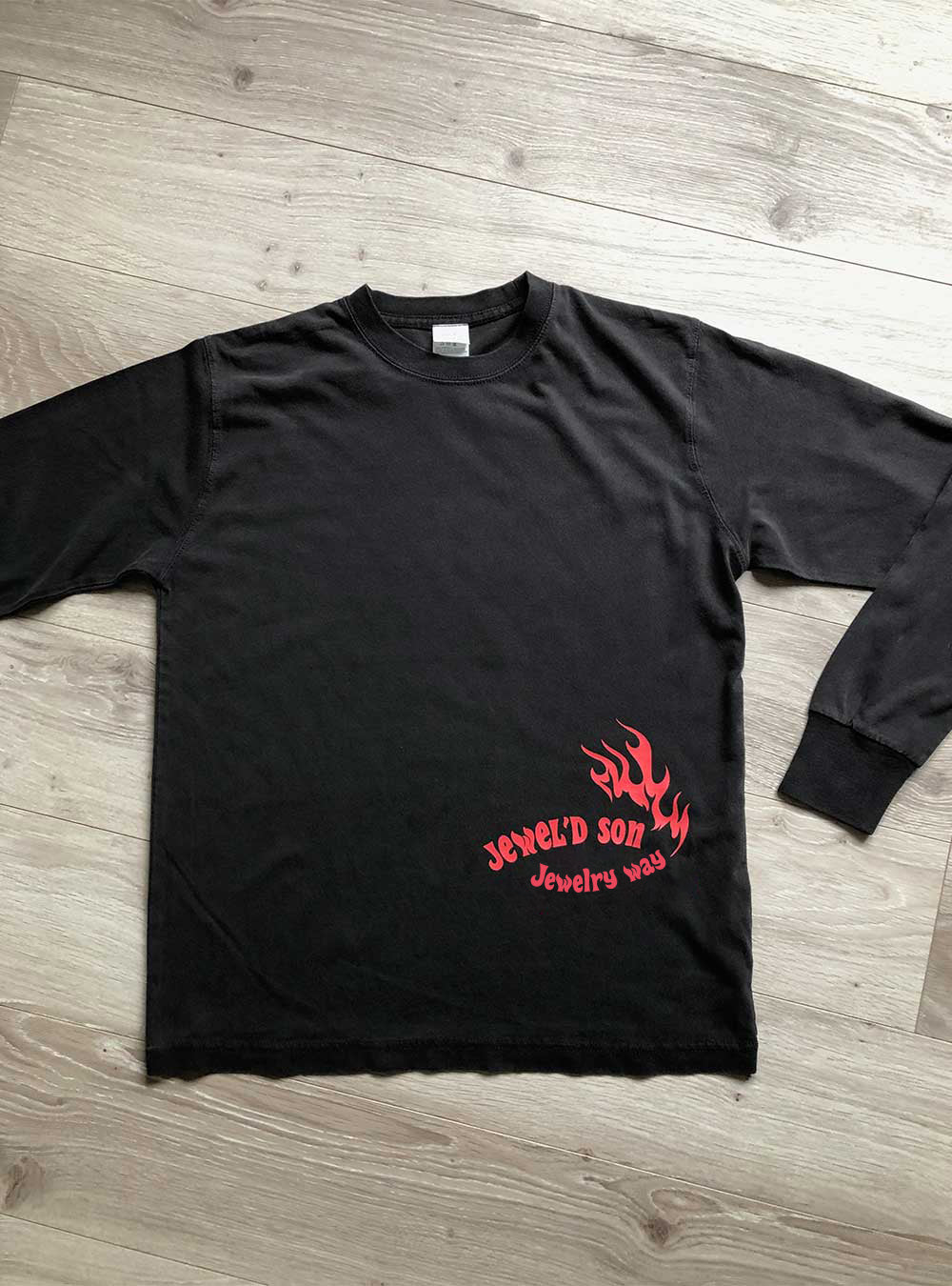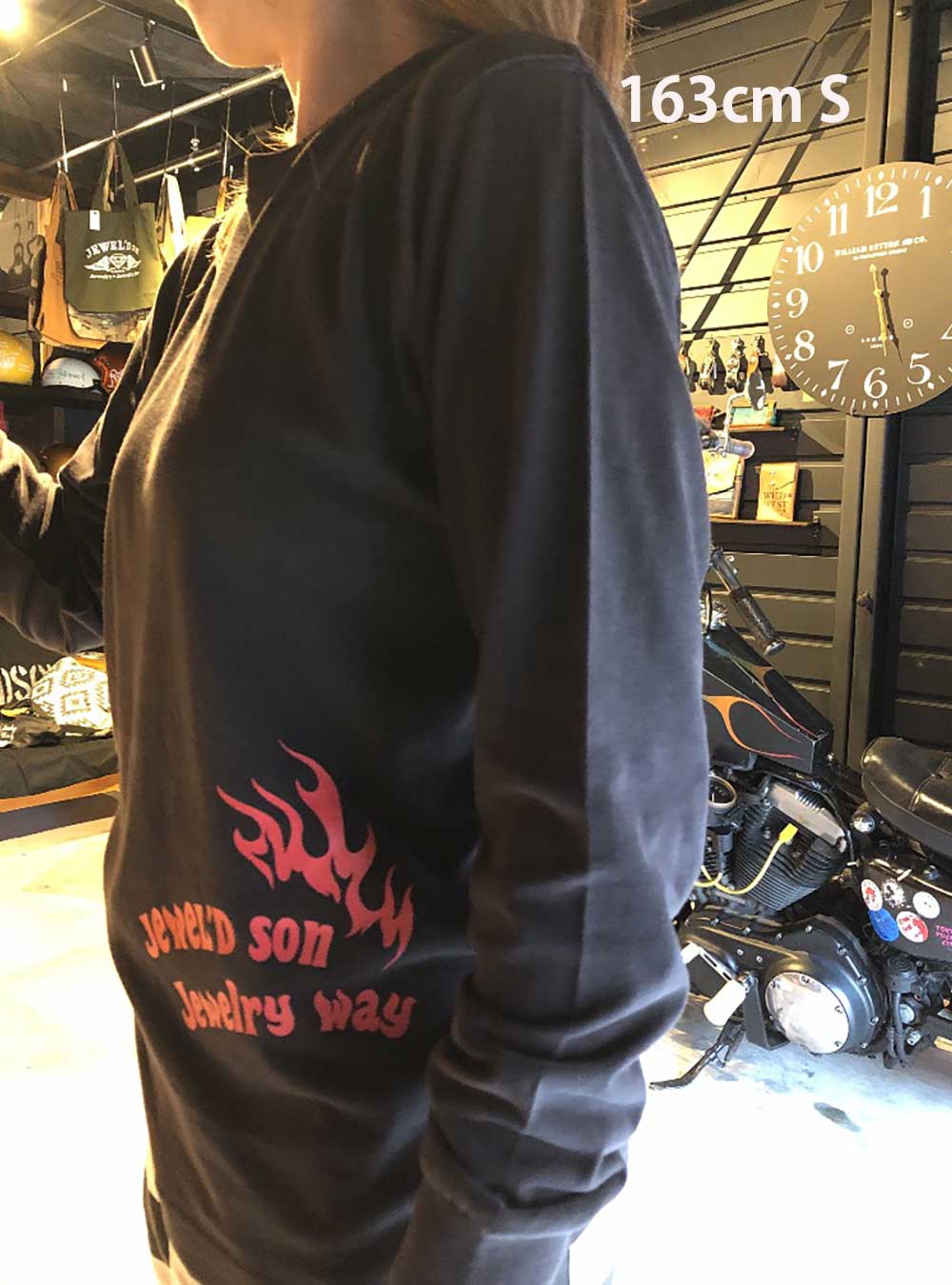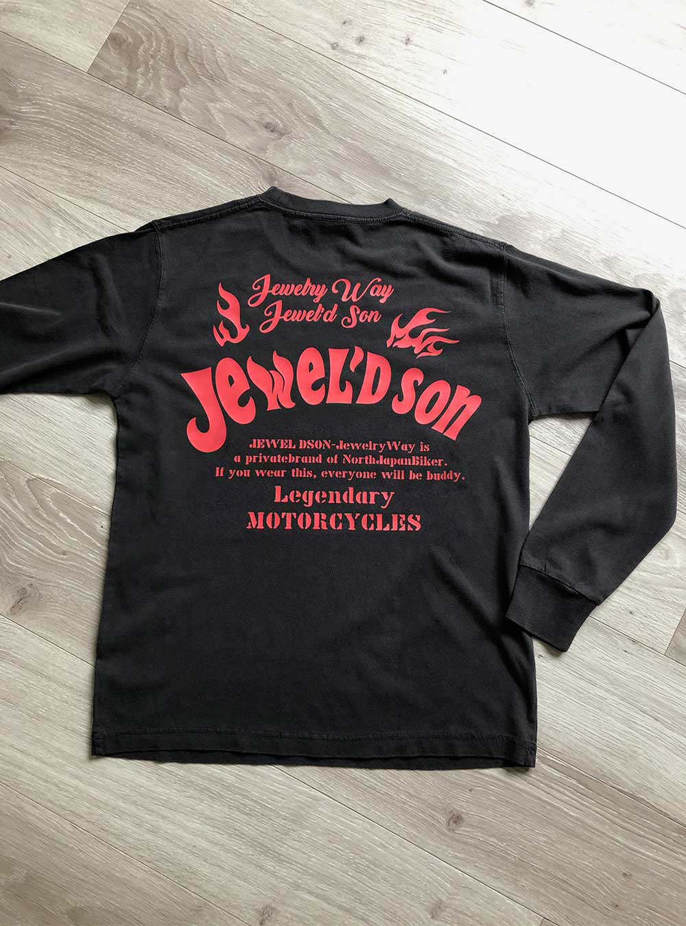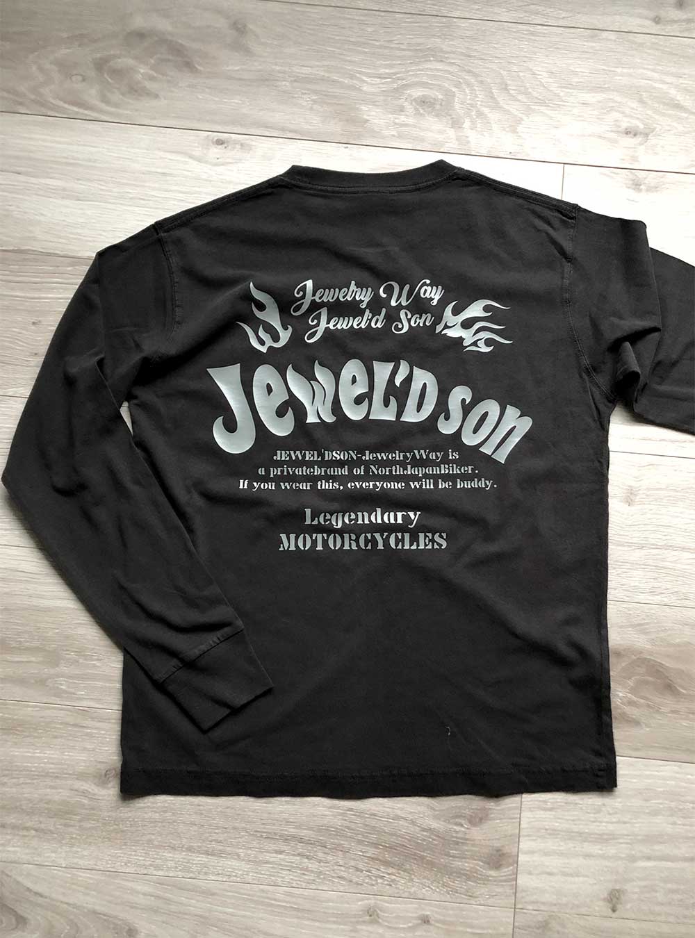 素材はハイクオリティ生地を使用した、ロングスリーブタイプ(袖口リブ仕様)。少しオーバーサイズでアウターにするのも良し、レイヤード(重ね着)でインナーにするのも良しの万能アイテム。バイカーには嬉しい袖リブ仕様。Jewel'd son Fireロゴプリント