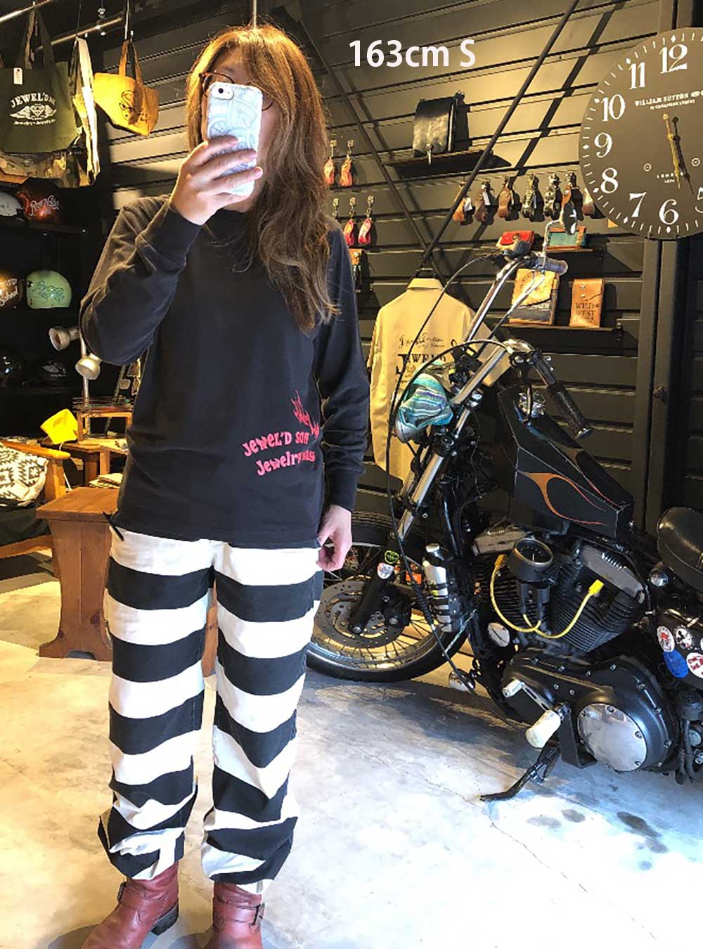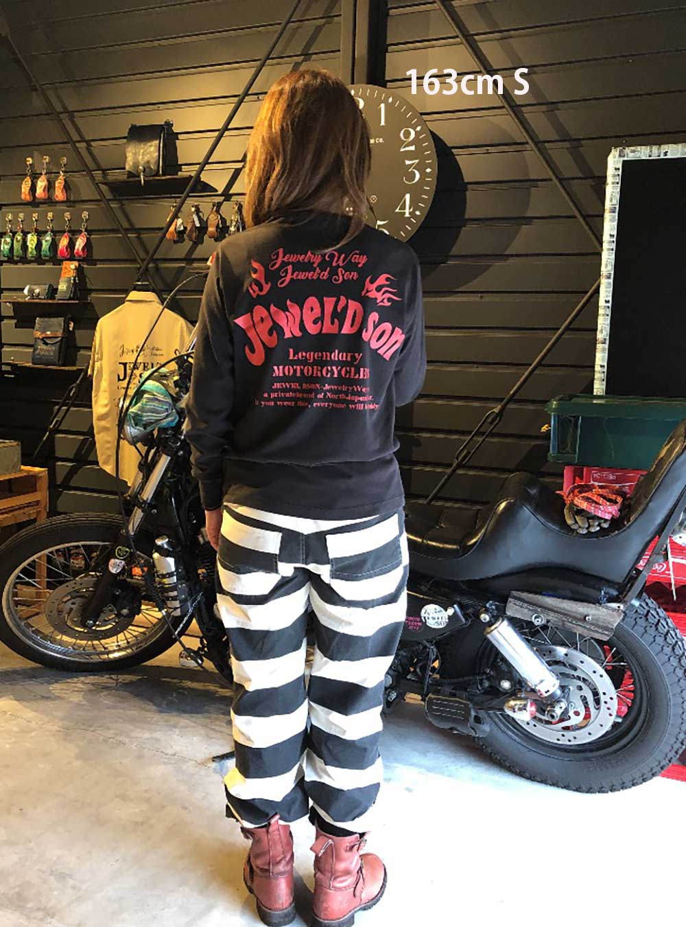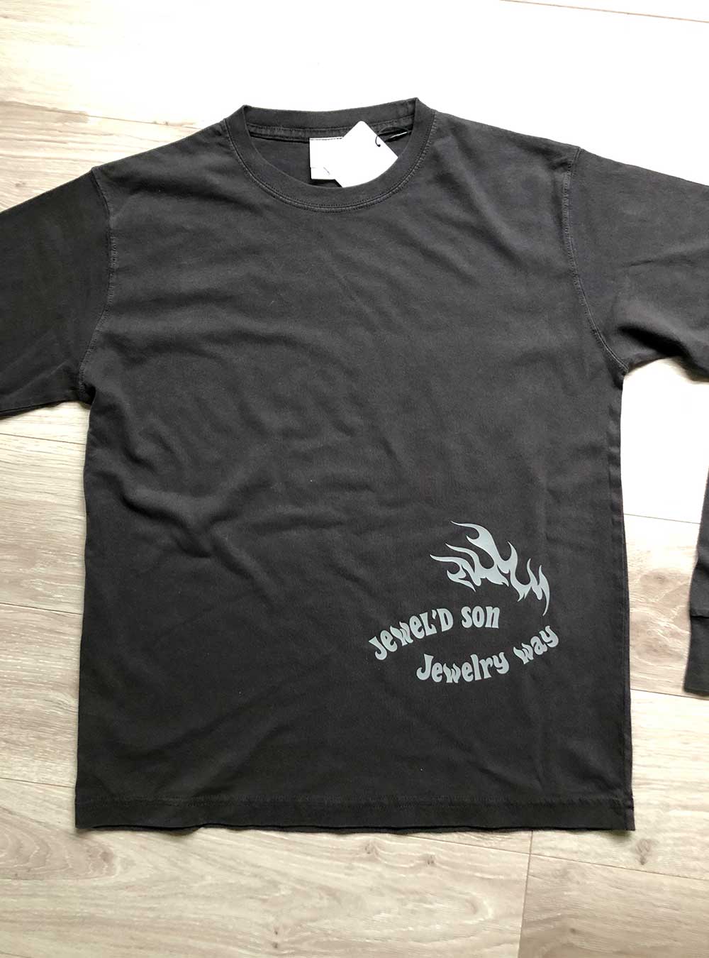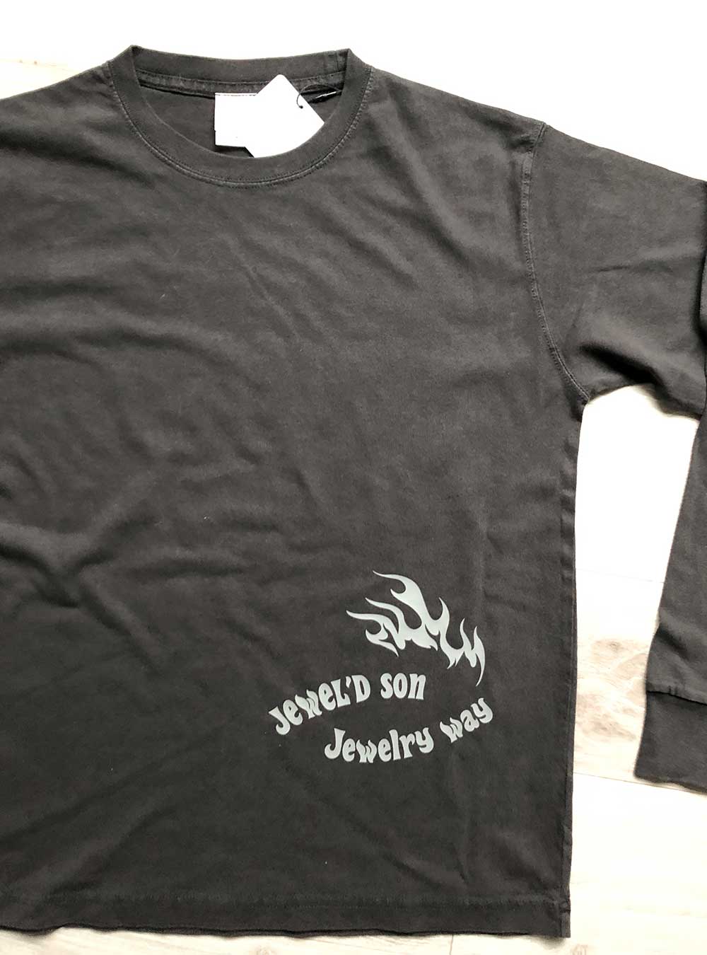 素材はハイクオリティ生地を使用した、ロングスリーブタイプ(袖口リブ仕様)。少しオーバーサイズでアウターにするのも良し、レイヤード(重ね着)でインナーにするのも良しの万能アイテム。バイカーには嬉しい袖リブ仕様。Jewel'd son Fireロゴプリント
