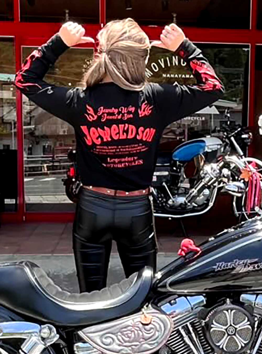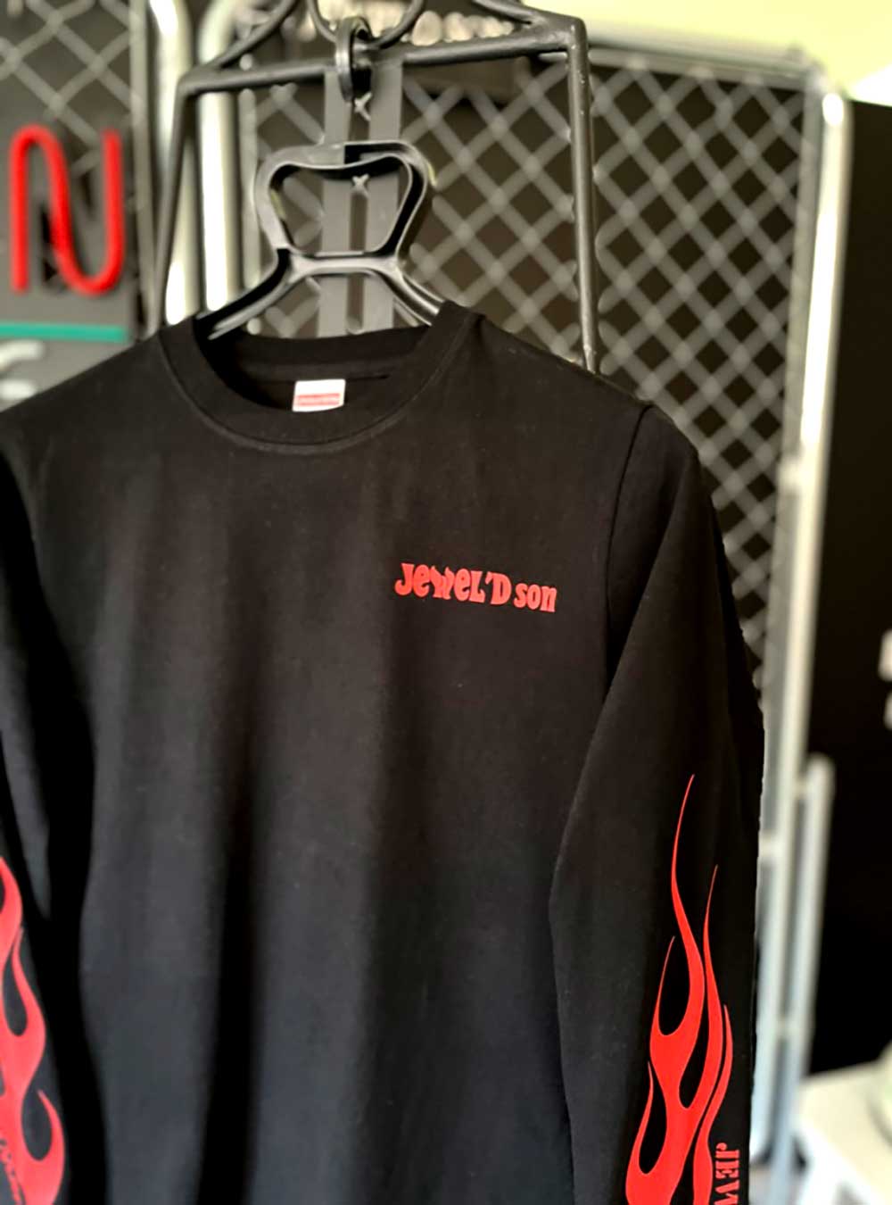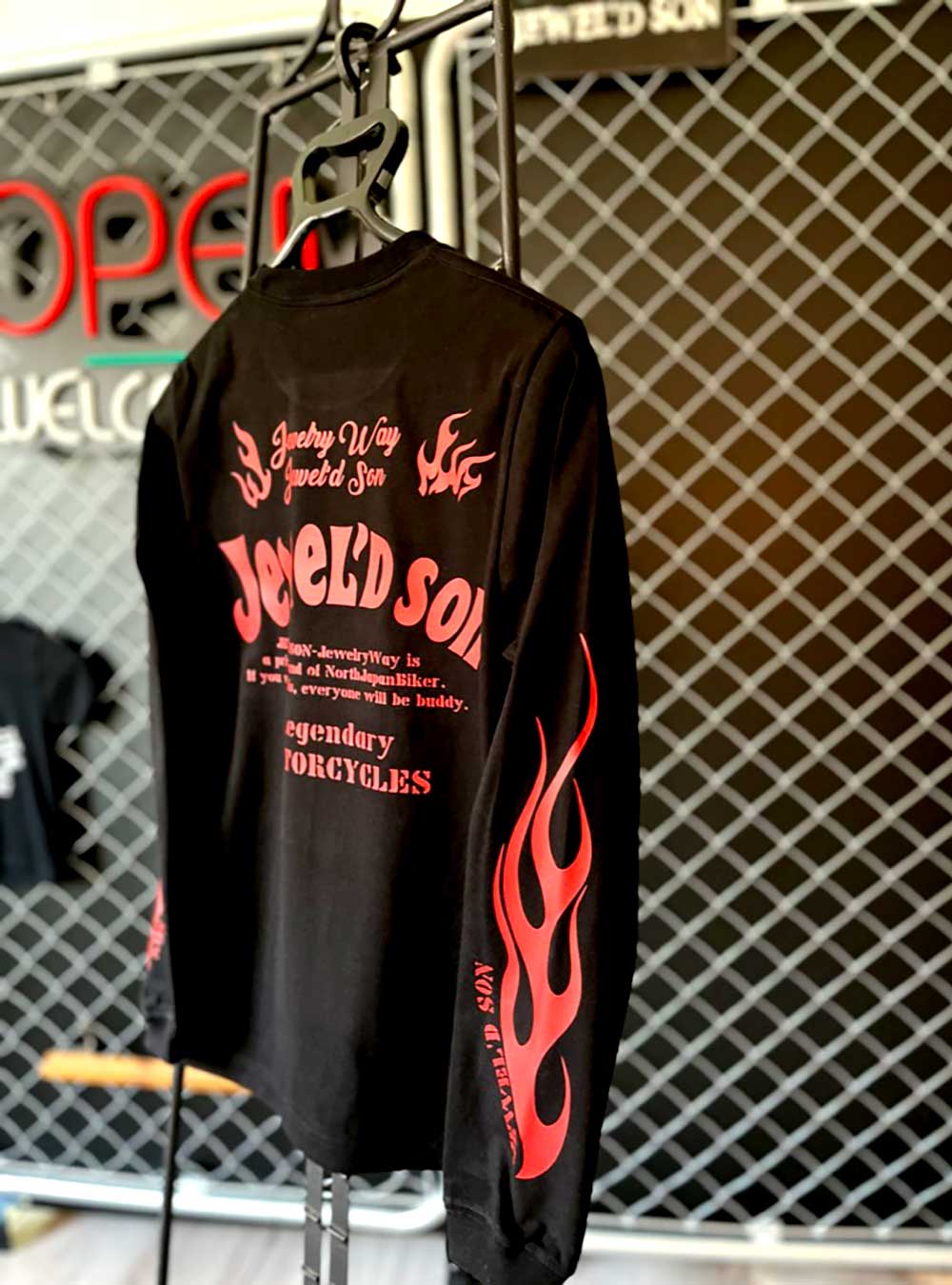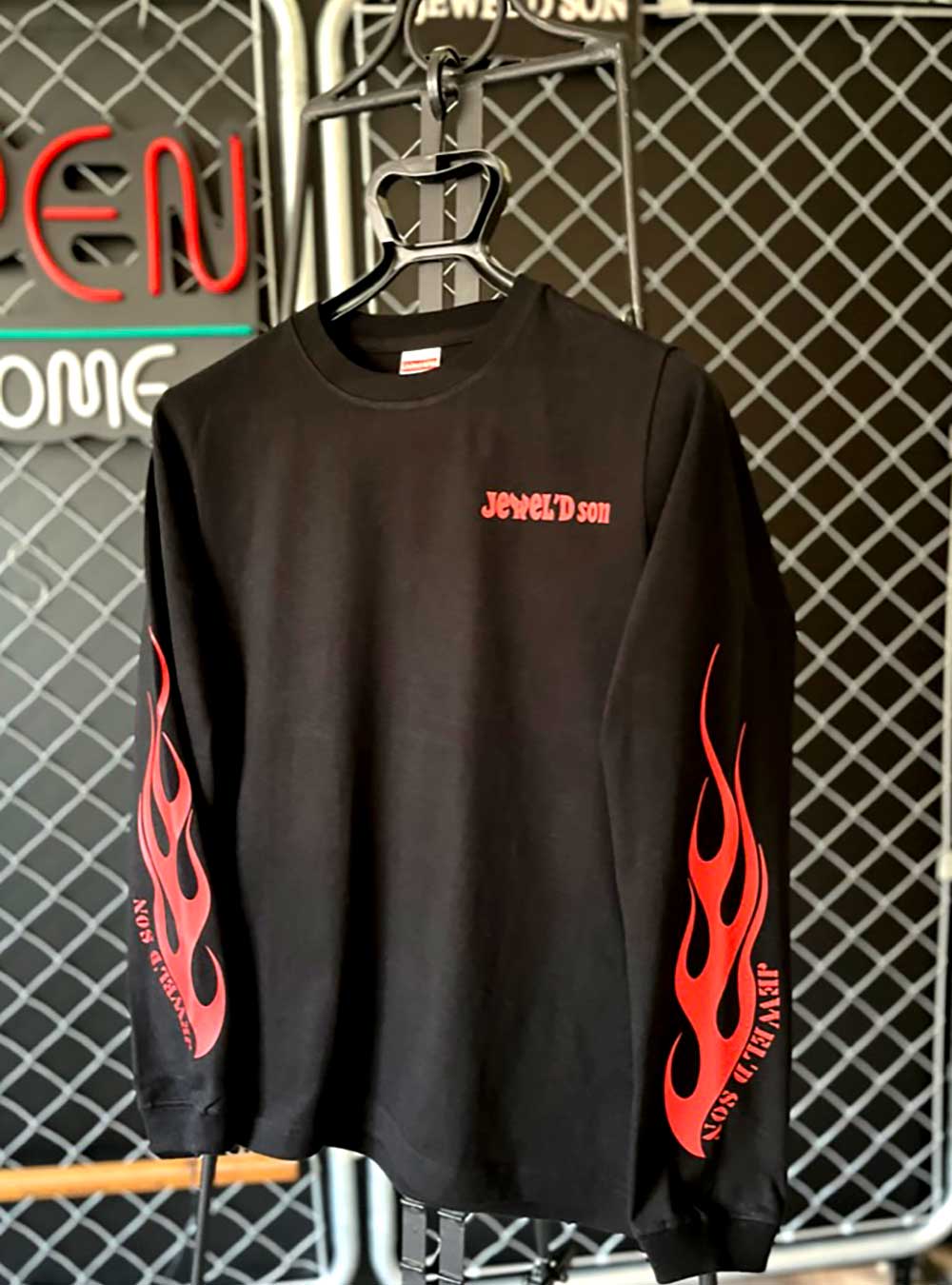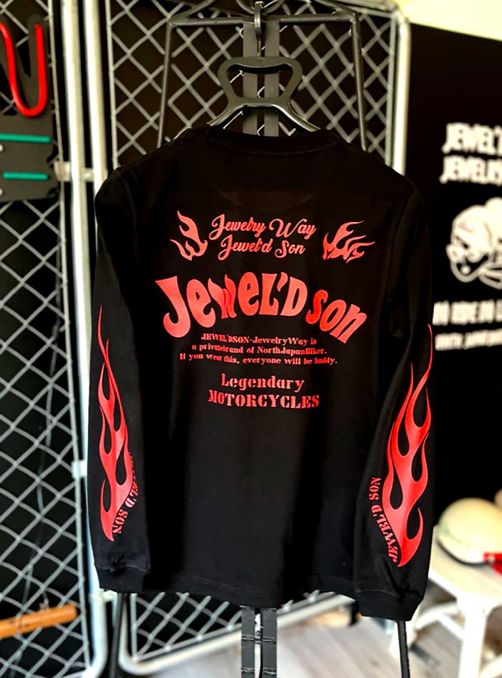 素材はハイクオリティ生地を使用した、ロングスリーブタイプ(袖口リブ仕様)。少しオーバーサイズでアウターにするのも良し、小さめサイズでレイヤード(重ね着)でインナーにするのも良しの万能アイテム。バイカーには嬉しい袖リブ仕様。Jewel'd son 袖Fireタイプ