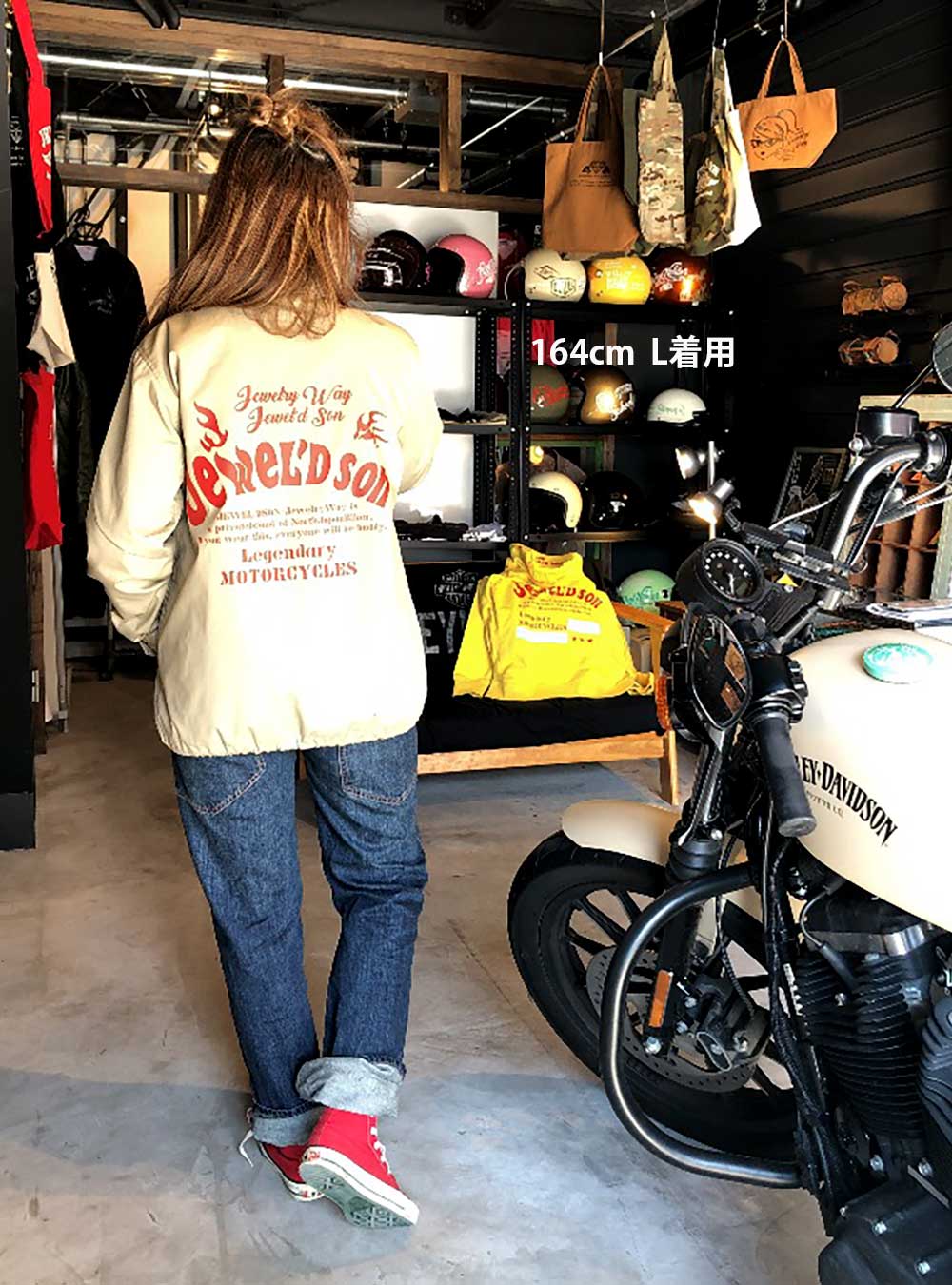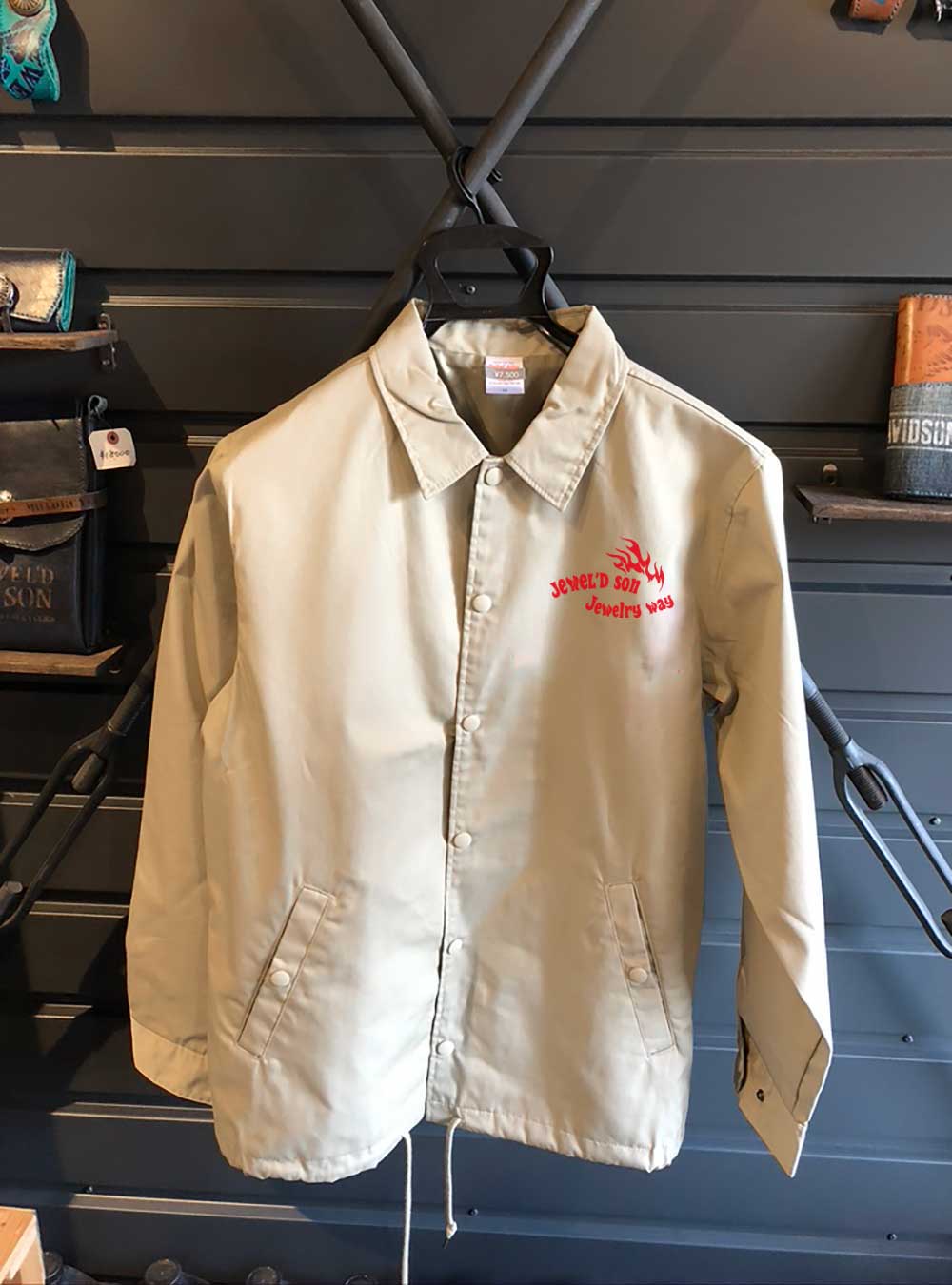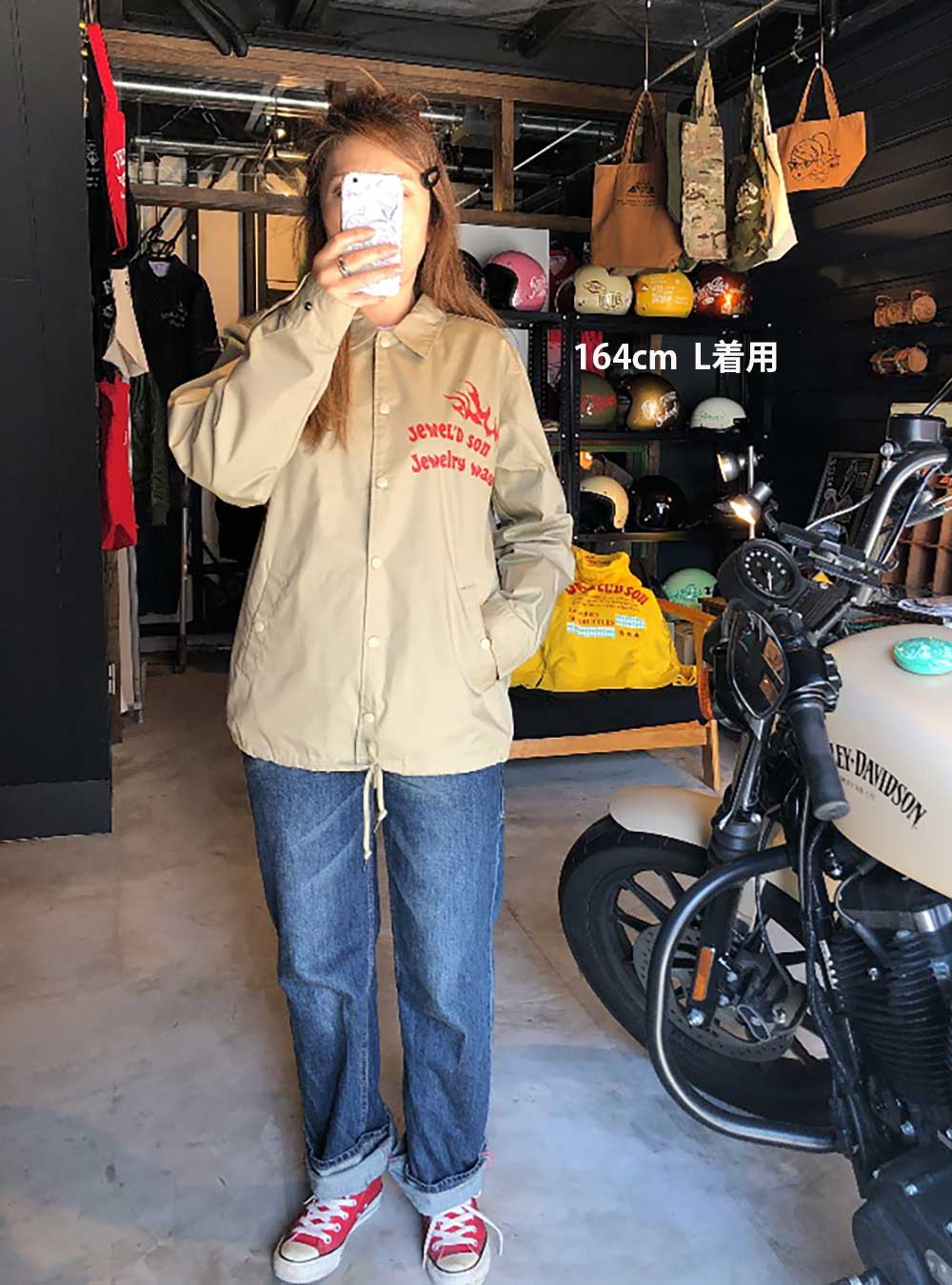 コーチジャケットをT/Cウェザーのマットな生地で仕上げ、L.A.ワーカーのスタイルを体現。JEWEL'D SON Fireロゴをプリントしたストリートスタイルへのコーディネートにも欠かせないコーチ!