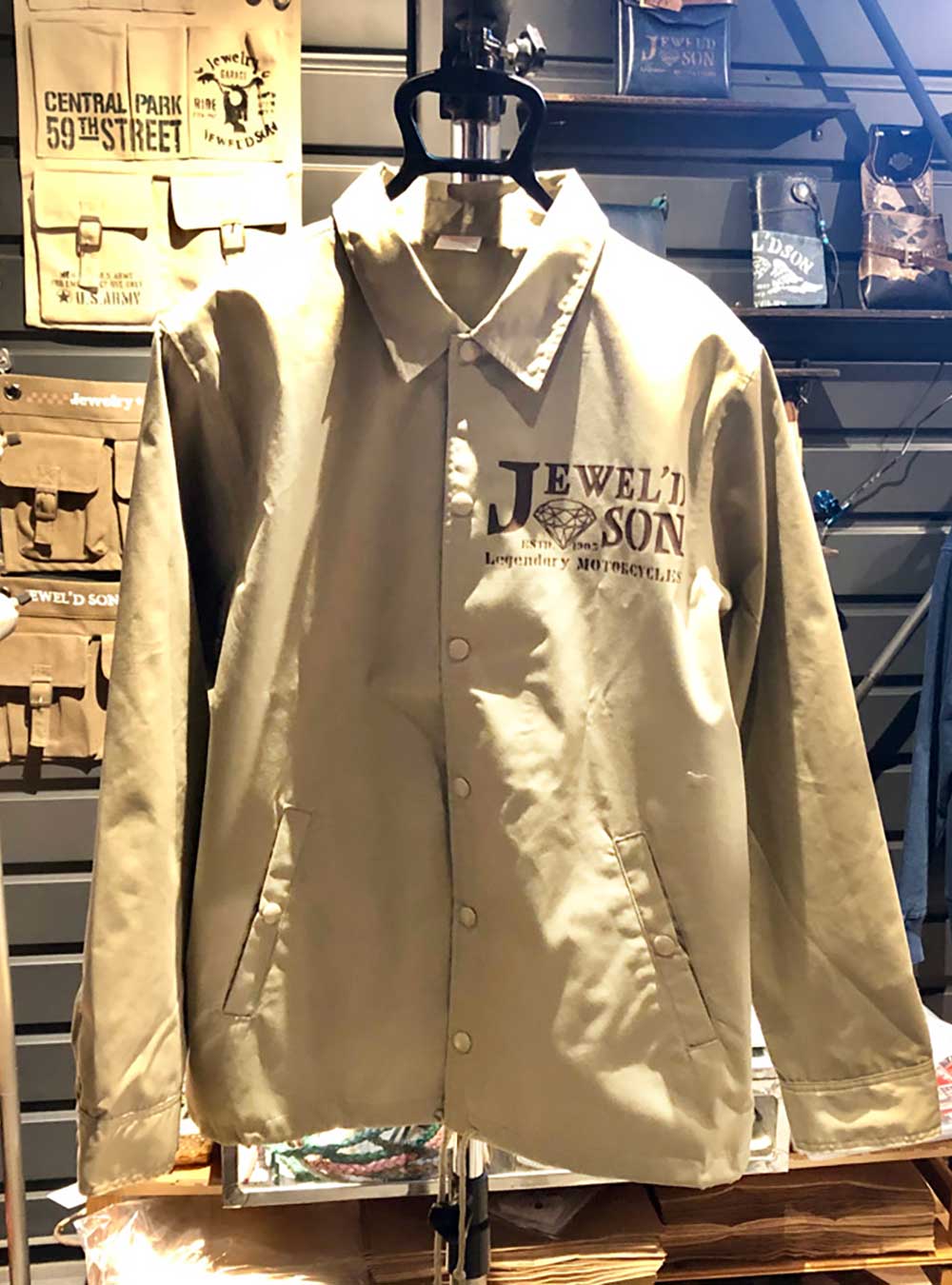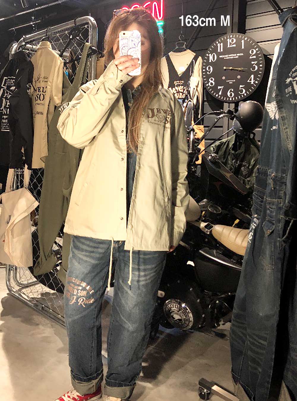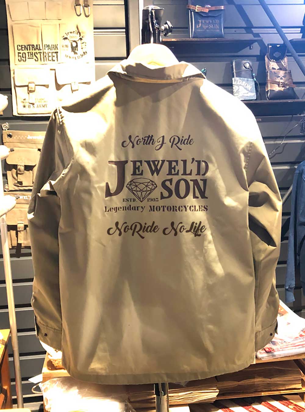 コーチジャケットをT/Cウェザーのマットな生地で仕上げ、L.A.ワーカーのスタイルを体現。JEWEL'D SON TEXTロゴをプリントしたストリートスタイルへのコーディネートにも欠かせないコーチ!