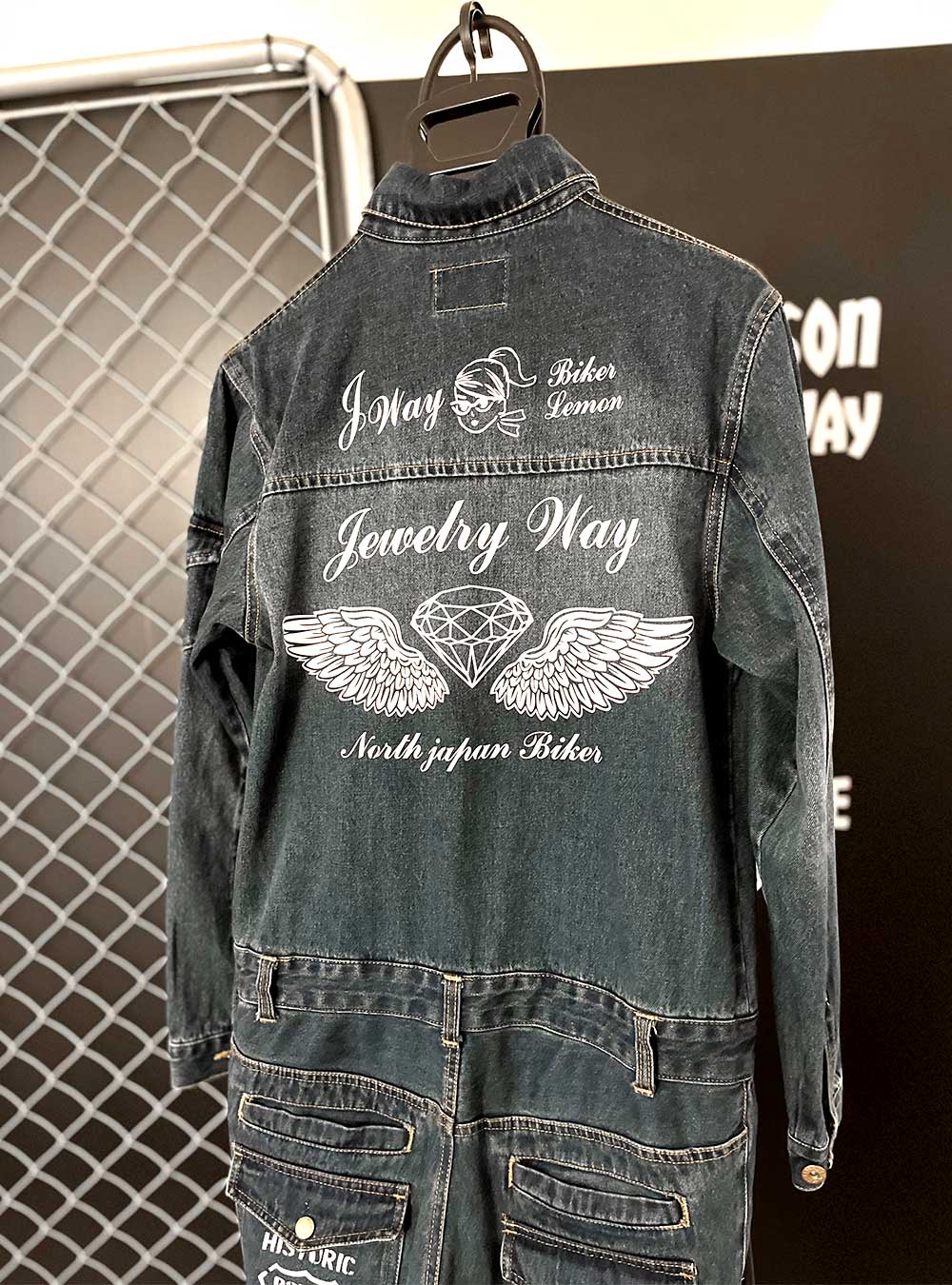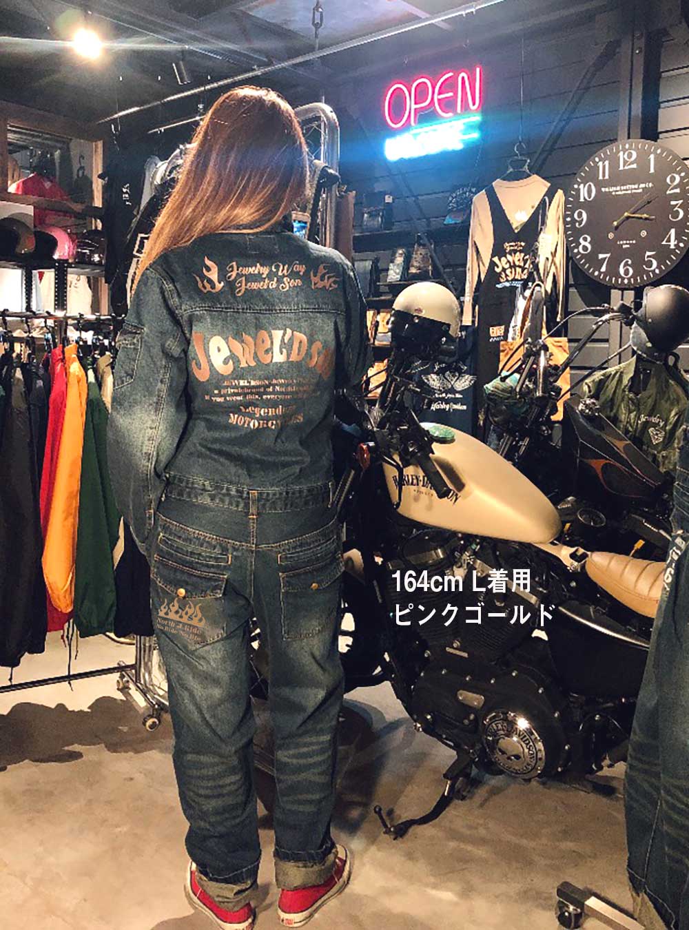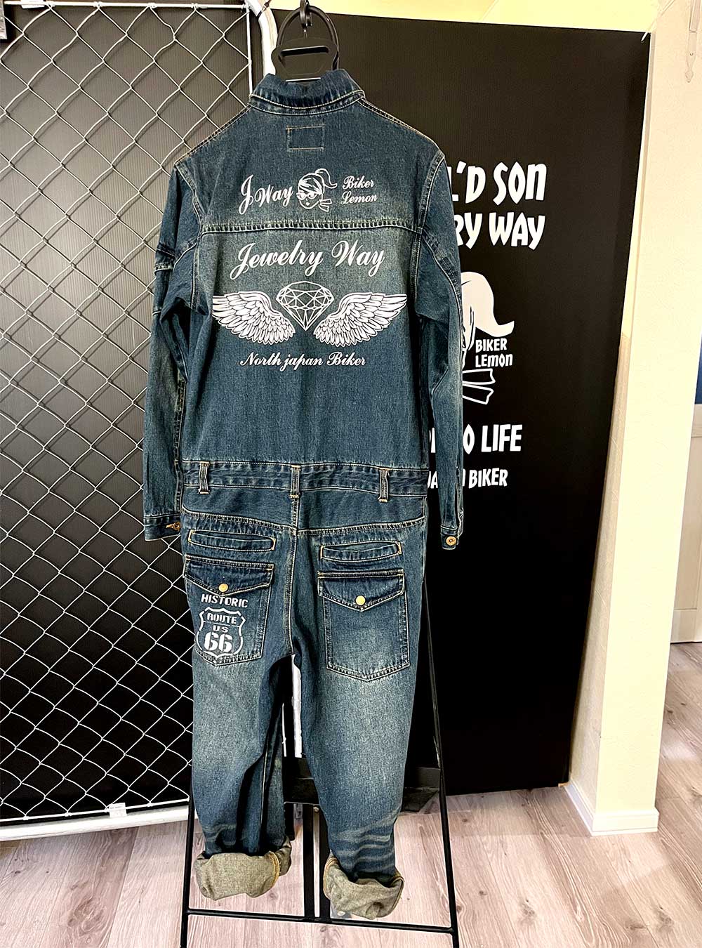 ツナギの型がかっこいい商品ですが、メーカー廃盤商品のため当店の在庫限りの数量限定です。Backは『Jewelry Wing』をプリントしました。お尻のポケット、胸、お尻のポケット、胸、足にもプリントしてます。