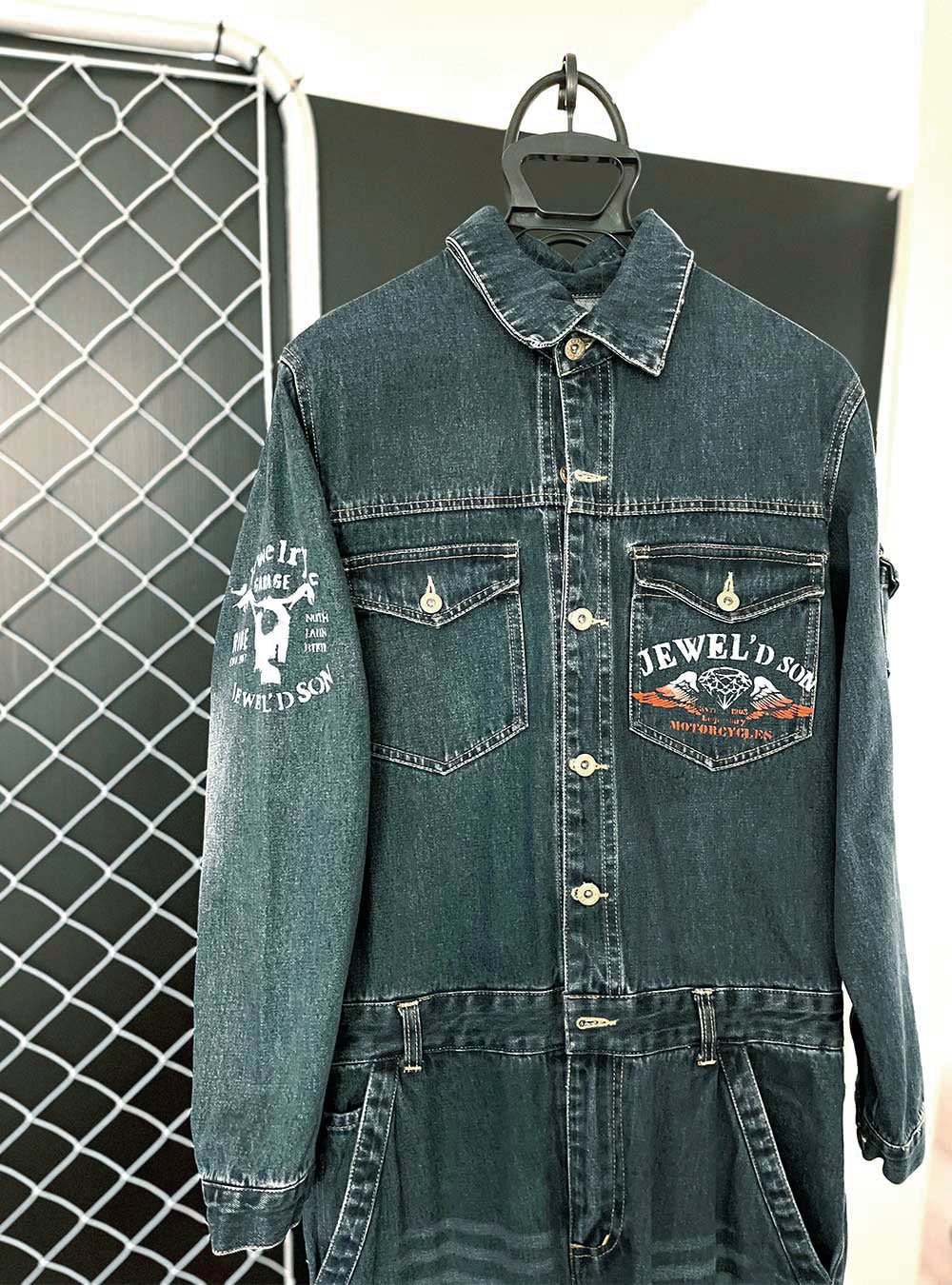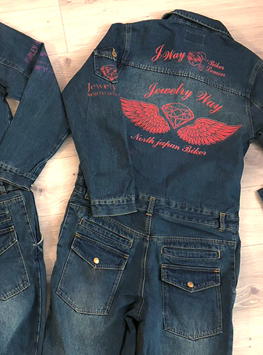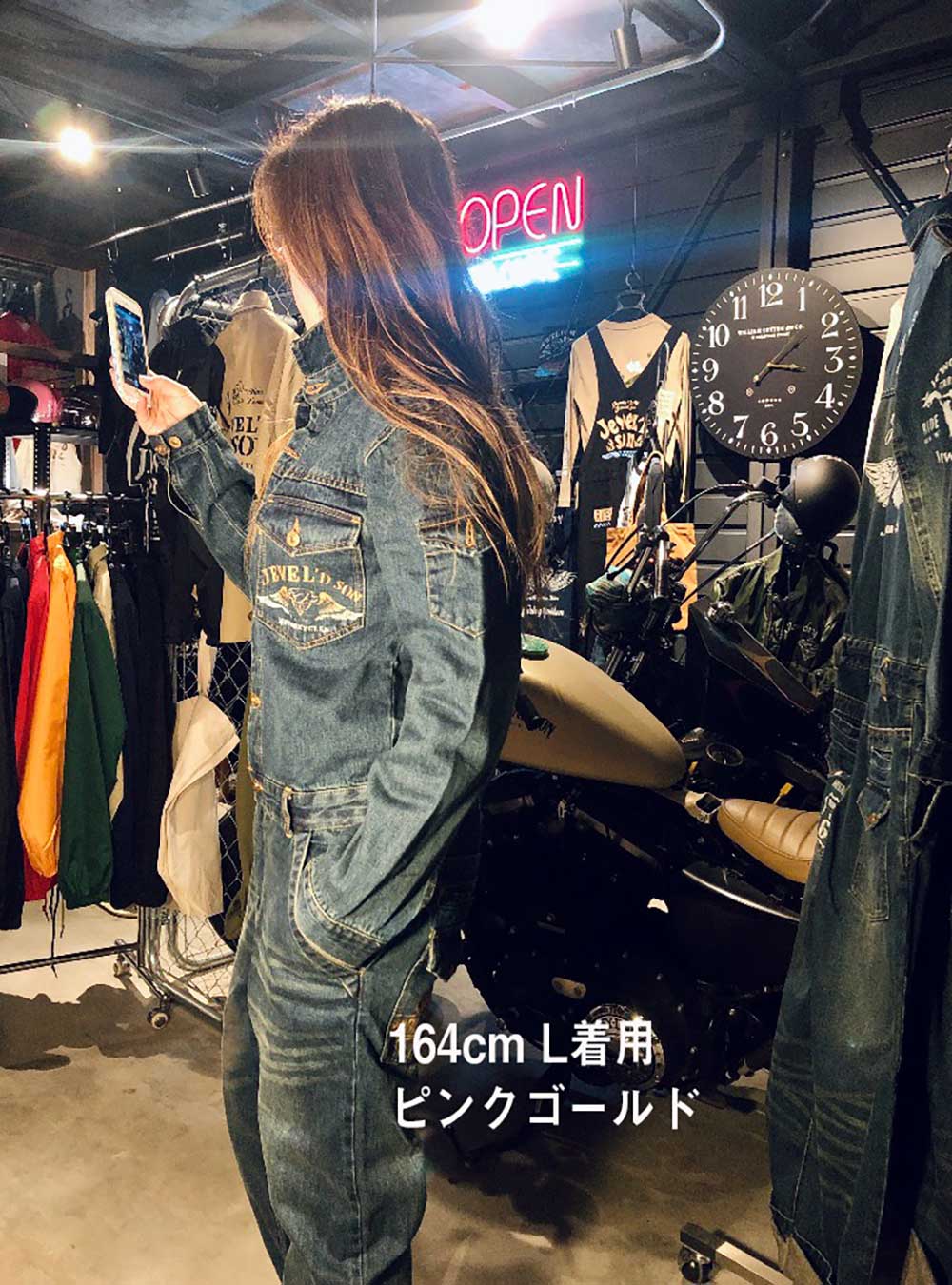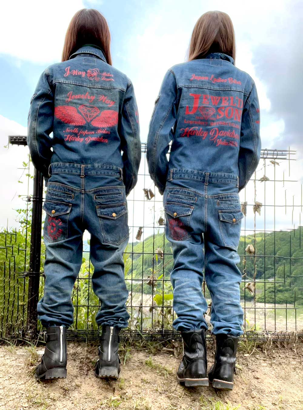 ツナギの型がかっこいい商品ですが、メーカー廃盤商品のため当店の在庫限りの数量限定です。Backは『Jewelry Wing』をプリントしました。お尻のポケット、胸、お尻のポケット、胸、足にもプリントしてます。