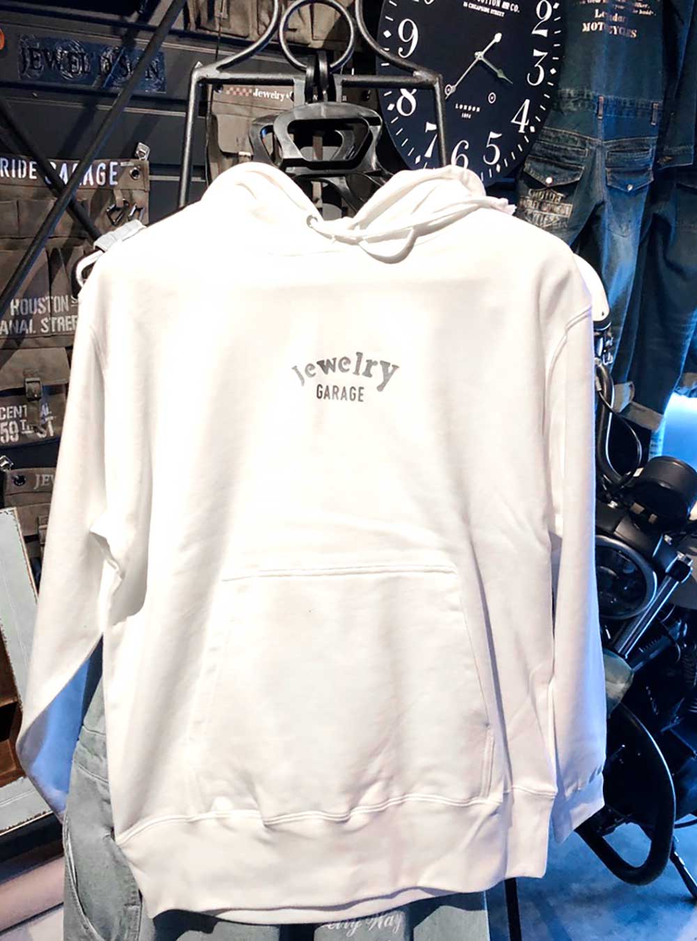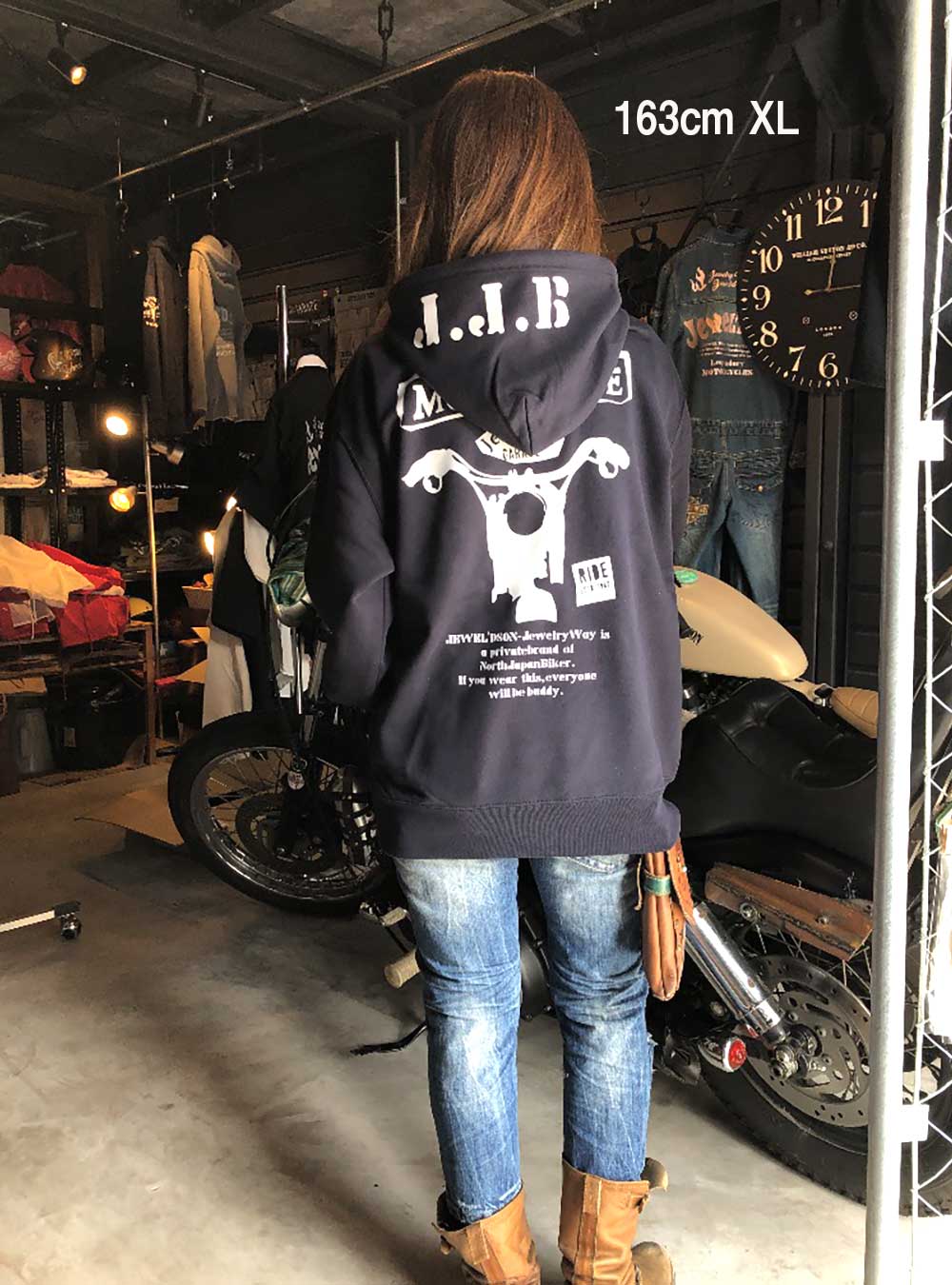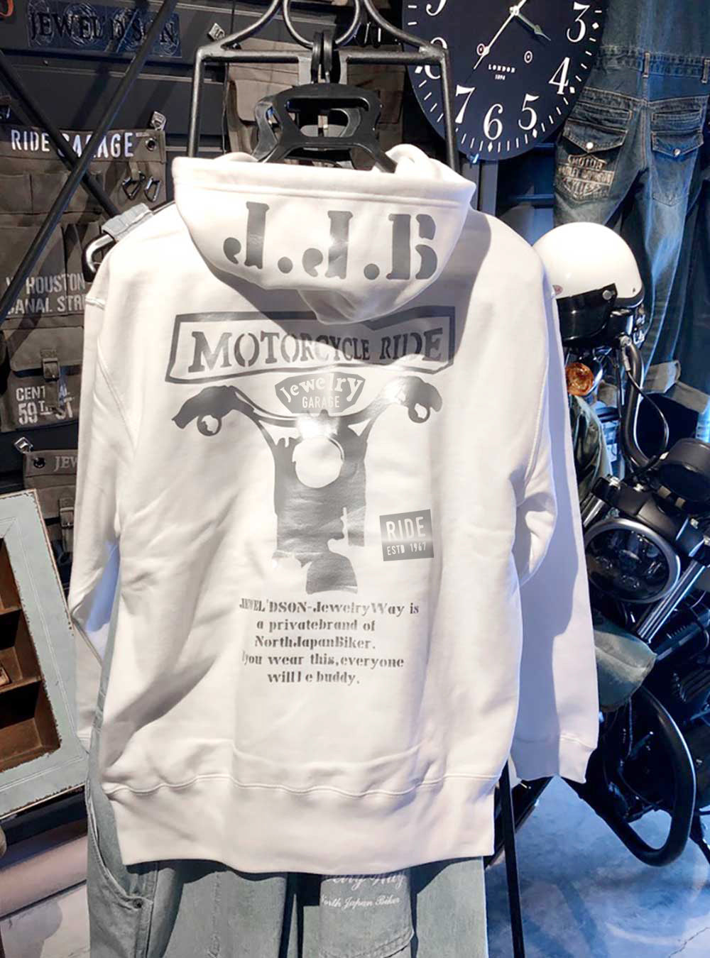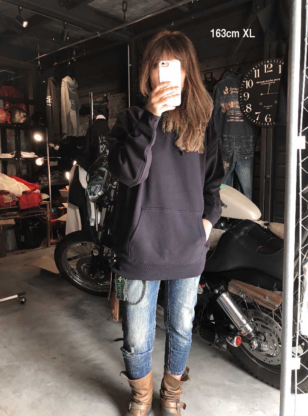 オシャレがキマル、プルオーバーパーカー。普段使いのコーディネートに合わせても活躍します。バックはバイクシルエットをシルバーでプリント。あらゆるシーンで活躍する10.0オンスでしっかりした素材のパーカーです。